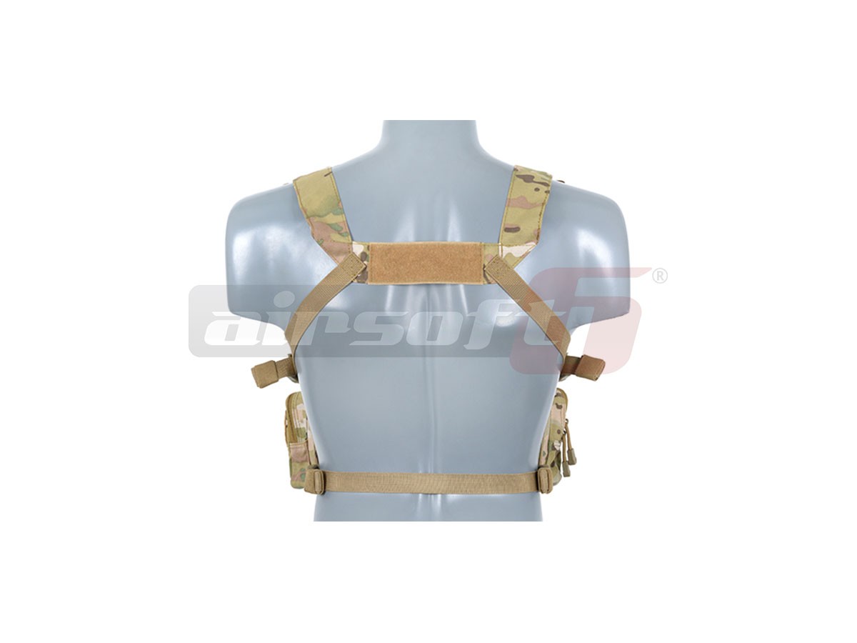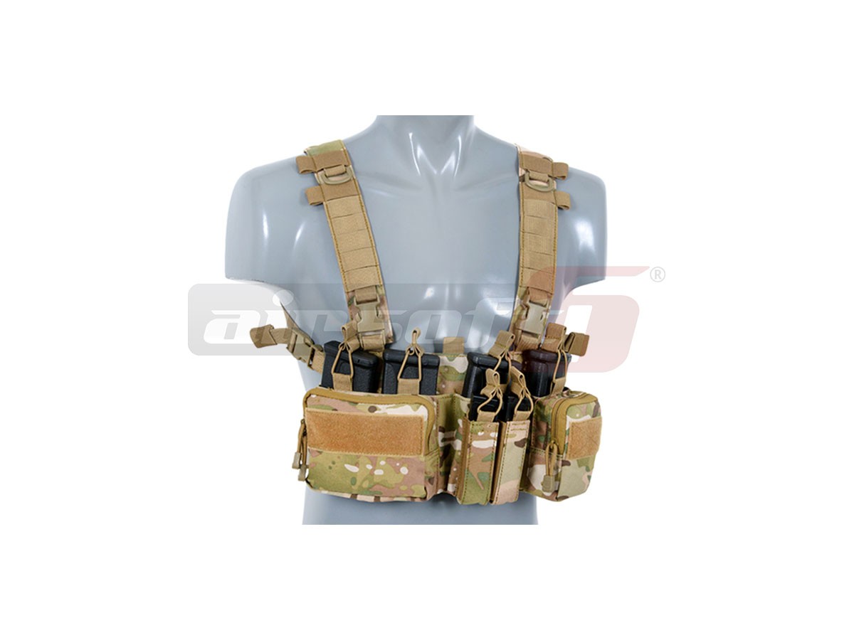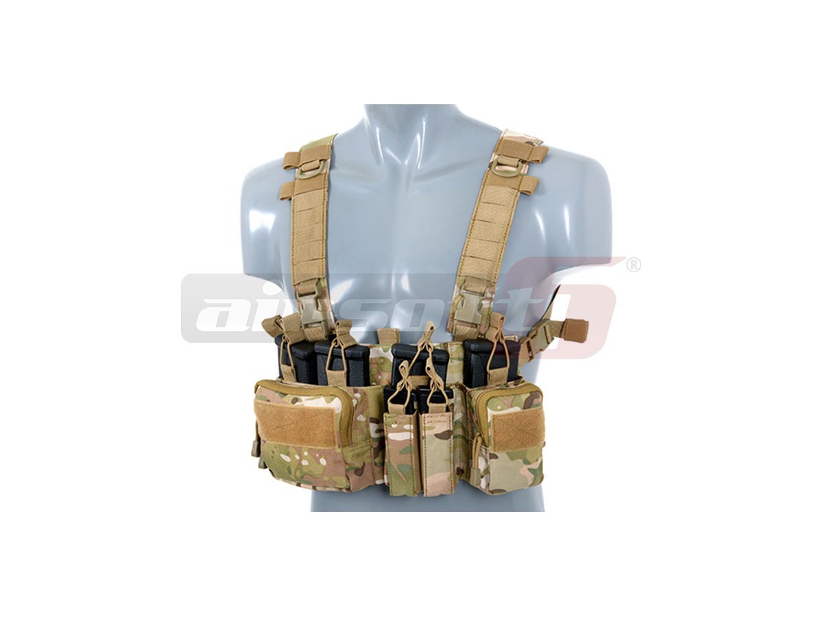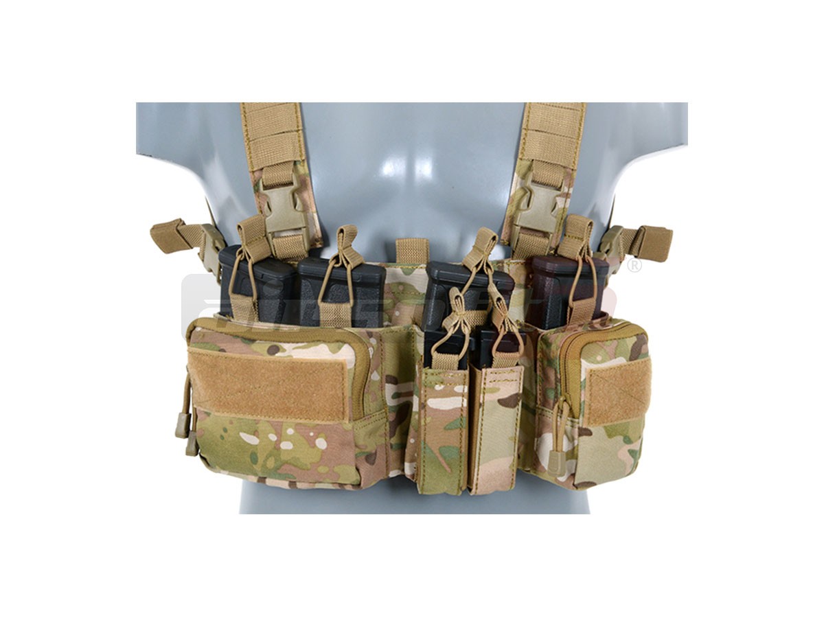 Acest harnasament tactic se numeste buckle up Recce Chest Rig si asa cum sugereaza si denumirea reprezinta o structura menita sa se ancoreze in partea frontala a utilizatorului dar fara a acoperi spatele, menita sa sustine elemente tactice prevazute cu sistemele de prindere de tip molle. Materialul din care este fabricat este nylonul impletit, captusit, rezistent la uzura si umiditate. Partea frontala prezinta o suprafata prevazuta cu sisteme de prindere molle dar si cu buzunare incorporate, permitand inmagazinarea directa a incarcatoarelor pe harnasament. Fiecare dintre cele 4 buzunare poate gaznui un incarcator de M4 sau chiar cate un incarcator de AK. Sistemele cu benzi elastice pot asigura pastrarea incarcatoarelor pe pozitie. Bretelele reglabile de fixare se incruciseaza in partea din spate pentru a imbunatati stabilitatea ansamblului iar in partea mijlocului exista inca o bretea orizontala deasemenea reglabila. Carabinele cu care bretelele de fixare se fixeaza, sunt realizate din plastic ABS iar designul celor superioare permite rotirea acestora pentru imbunatatirea confortului atunci cand utilizatorul este intens activ.
