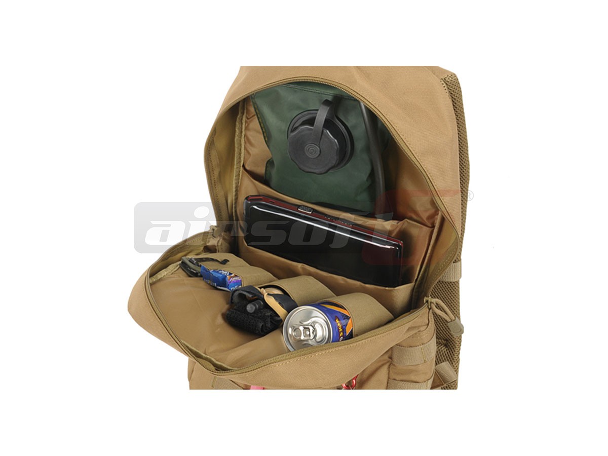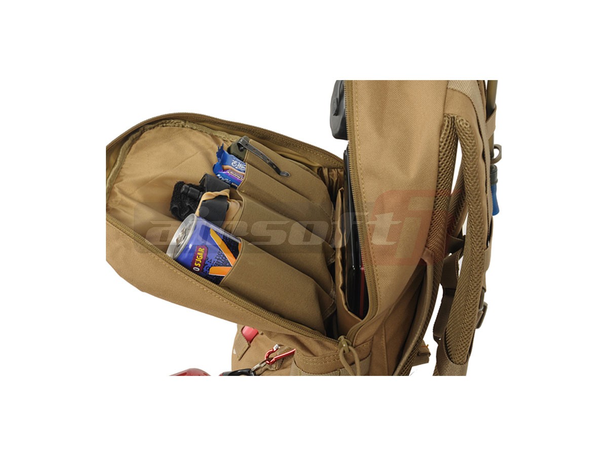 In ceea ce priveste compartimentarea rucsacului avem: Un compartiment mare in partea centrala impartit la randul sau in 2 alte compartimente. Poate fi inmagazinata o plosca pentru apa, sau alte obiecte de dimensiuni asemanatoare, existand protectia necesara. Pe suprafata exterioara a rucsacului exista numeroase sectiuni prevazute cu molle pentru a permite atasarea accesoriilor dotate cu acest sistem de prindere.