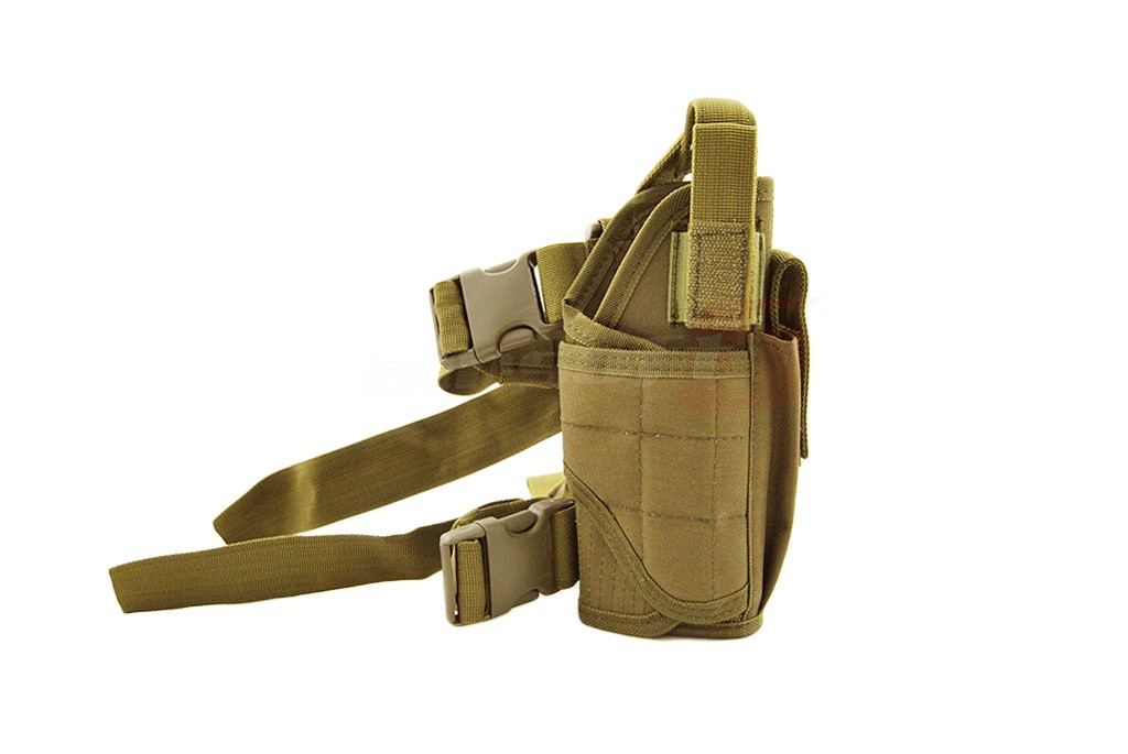 Acest toc este reglabil si permite montarea unei mari varietati de pistoale. Este fabricat din nylon grosime 600D si 1000D astfel asigurand o rezistenta sporita la umezeala. Tocul este prevazut cu un port incarcator. Este dotat cu 3 prinderi reglabile. Una superioara si 2 pentru picior toate prevazute cu catarama cu carlig.