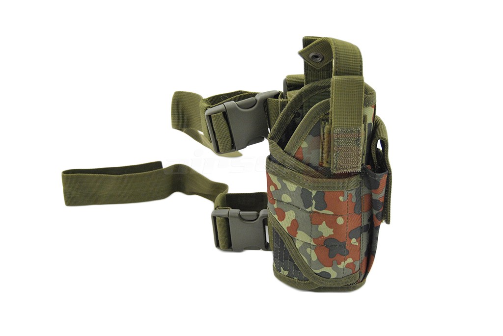 Acest toc este reglabil si permite montarea unei mari varietati de pistoale. Este fabricat din nylon grosime 600D si 1000D astfel asigurand o rezistenta sporita la umezeala. Tocul este prevazut cu un port incarcator. Este dotat cu 3 prinderi reglabile. Una superioara si 2 pentru picior toate prevazute cu catarama cu carlig.