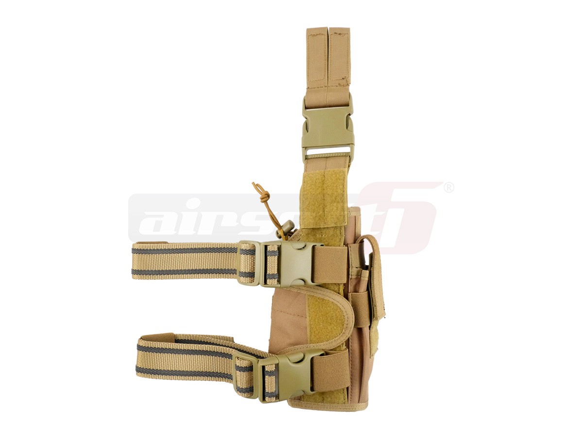 Toc pentru pistol cu prindere pe picior si centura cu pozitie pentru partea stanga. Acest toc este fabricat din nylon rezistent iar legaturile si cataramele sunt confectionate din plastic ABS de calitate. Printre avantajele acestui sistem de prindere se numara; posibilitatea de a regla marimea tocului in functie de pistolul utilizat pentru o mai buna fixare, un sistem elastic de asigurare a pistolului in toc, rapid si posibilitatea de a monta accesorii suplimentare utilizand sistemul molle extern, un exemplu bun de accesorii ar fi buzunare port incarcatoare pistol suplimentare. Tocul are incorporat un buzunar pentru un incarcator suplimentar.