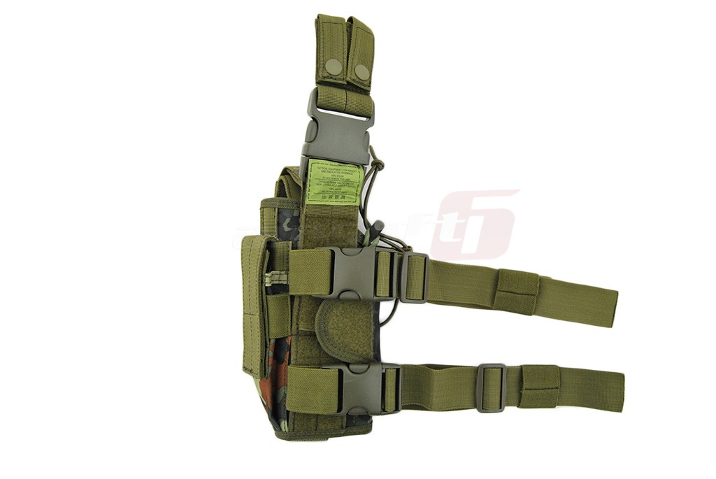 Toc pentru pistol cu prindere pe picior si centura. Acest toc este fabricat din nylon rezistent iar legaturile si cataramele sunt confectionate din plastic ABS de calitate. Printre avantajele acestui sistem de prindere se numara; posibilitatea de a regla marimea tocului in functie de pistolul utilizat pentru o mai buna fixare, un sistem elastic de asigurare a pistolului in toc, rapid si posibilitatea de a monta accesorii suplimentare utilizand sistemul molle extern, un exemplu bun de accesorii ar fi buzunare port incarcatoare pistol suplimentare. Tocul are incorporat un buzunar pentru un incarcator suplimentar.