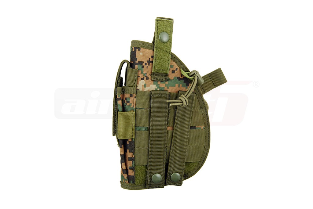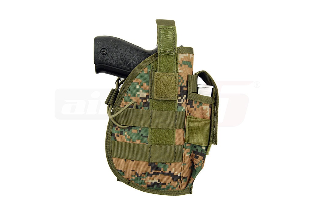 Toc pentru pistol cu prindere de tip molle. Utilizand acest tip de prindere, tocul poate fi montat pe orice platforma este prevazuta cu acest sistem de prindere. Spre exemplu; pe vesta tactica sau pe centura. Marimea tocului este fixa dar designul sau permita sustinerea unei mari varietati de pistoale de airsoft. Pentru asigurarea pistolului exista 2 sisteme. O chinga prevazuta cu arici si capsa si un elastic reglabil pentru fixare rapida. Lungimea chingii poate fi reglata.
