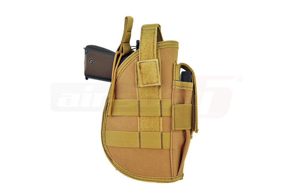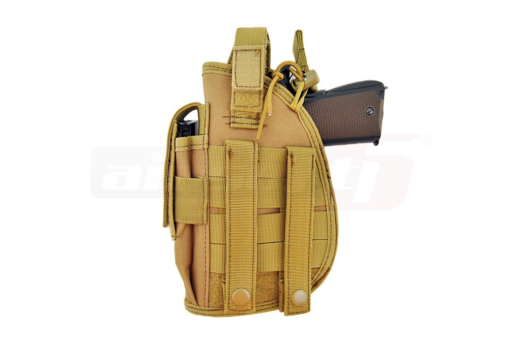 Toc pentru pistol cu prindere de tip molle. Utilizand acest tip de prindere, tocul poate fi montat pe orice platforma este prevazuta cu acest sistem de prindere. Spre exemplu; pe vesta tactica sau pe centura. Marimea tocului este fixa dar designul sau permita sustinerea unei mari varietati de pistoale de airsoft. Pentru asigurarea pistolului exista 2 sisteme. O chinga prevazuta cu arici si capsa si un elastic reglabil pentru fixare rapida. Lungimea chingii poate fi reglata.
