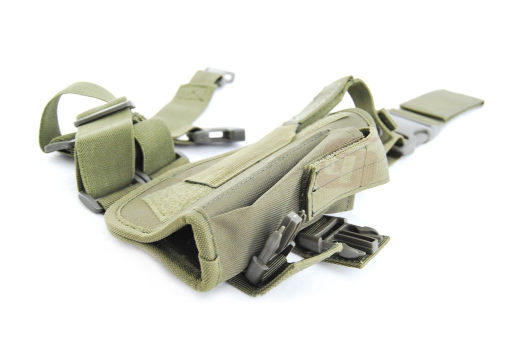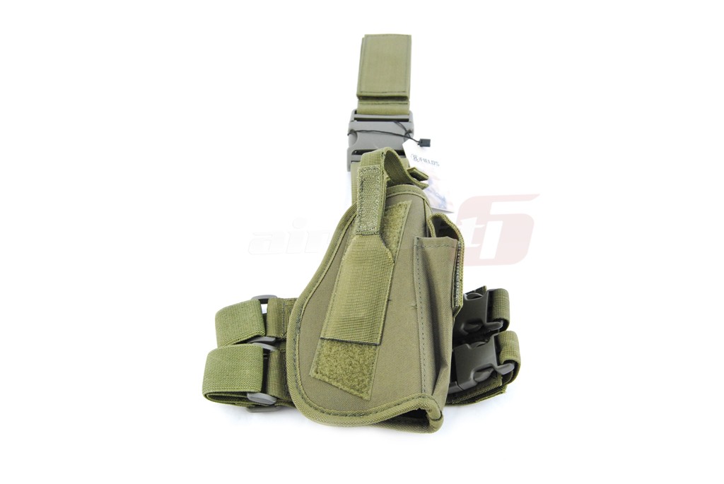 Toc pentru picior cu fixare pe centura si picior. Acest toc nu este reglabil dar dimensiunile si forma sa asigura fixarea unei vari varietati de pistoale de airsoft. Tocul are si un buzunar pentru incarcator suplimentar. Sistemul asigurare a pistolului este reglabil oferind o prindere cat mai fixa in functie de modelul de pistol utilizat. Prinderile curelelor si cataramele sunt fabricate din plastic rezistent iar prinderile sunt prevazute cu o sectiune elastica destinata confortului utilizatorului. Acest toc nu poate fi montat direct pe centura deoarece este special conceput pentru picior.