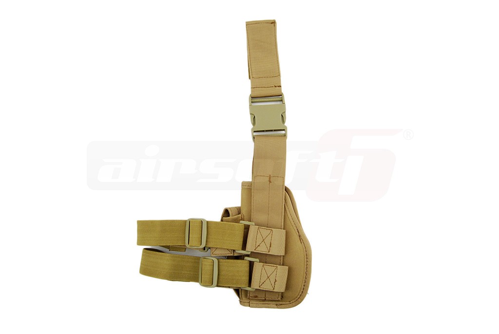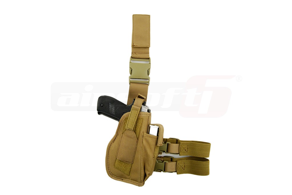 Toc pentru picior cu fixare pe centura si picior. Acest toc nu este reglabil dar dimensiunile si forma sa asigura fixarea unei vari varietati de pistoale de airsoft. Tocul are si un buzunar pentru incarcator suplimentar. Sistemul asigurare a pistolului este reglabil oferind o prindere cat mai fixa in functie de modelul de pistol utilizat. Prinderile curelelor si cataramele sunt fabricate din plastic rezistent iar prinderile sunt prevazute cu o sectiune elastica destinata confortului utilizatorului. Acest toc nu poate fi montat direct pe centura deoarece este special conceput pentru picior.