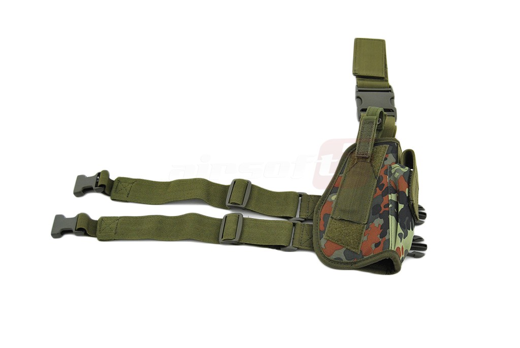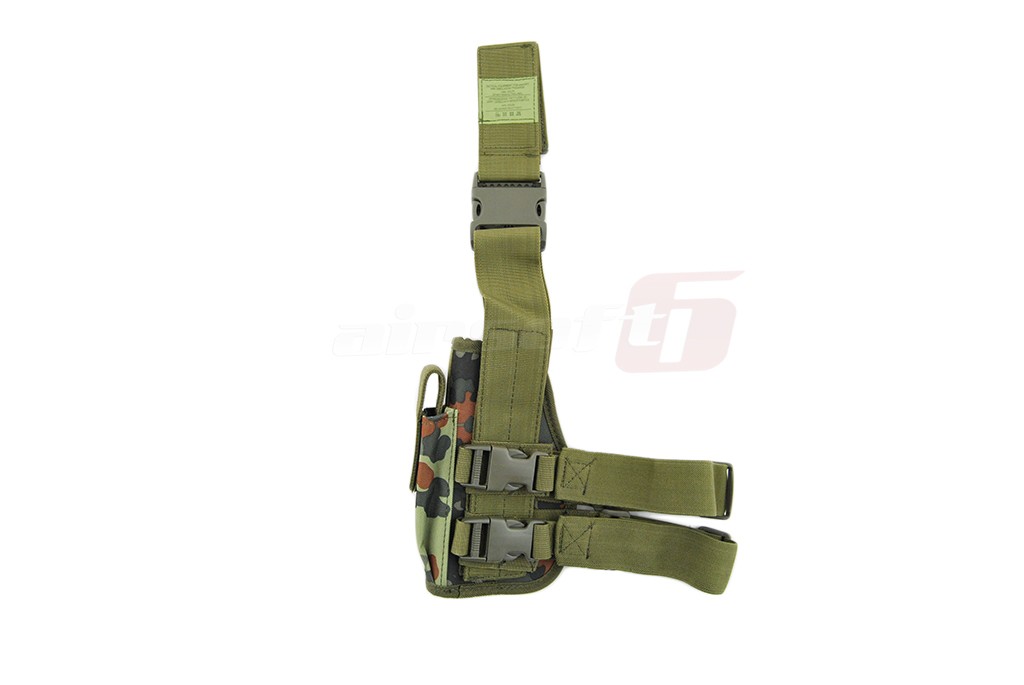 Toc pentru picior cu fixare pe centura si picior. Acest toc nu este reglabil dar dimensiunile si forma sa asigura fixarea unei vari varietati de pistoale de airsoft. Tocul are si un buzunar pentru incarcator suplimentar. Sistemul asigurare a pistolului este reglabil oferind o prindere cat mai fixa in functie de modelul de pistol utilizat. Prinderile curelelor si cataramele sunt fabricate din plastic rezistent iar prinderile sunt prevazute cu o sectiune elastica destinata confortului utilizatorului. Acest toc nu poate fi montat direct pe centura deoarece este special conceput pentru picior.