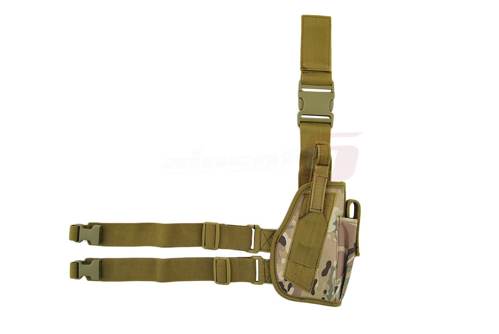 Toc pentru picior cu fixare pe centura si picior. Acest toc nu este reglabil dar dimensiunile si forma sa asigura fixarea unei vari varietati de pistoale de airsoft. Tocul are si un buzunar pentru incarcator suplimentar. Sistemul asigurare a pistolului este reglabil oferind o prindere cat mai fixa in functie de modelul de pistol utilizat. Prinderile curelelor si cataramele sunt fabricate din plastic rezistent iar prinderile sunt prevazute cu o sectiune elastica destinata confortului utilizatorului. Acest toc nu poate fi montat direct pe centura deoarece este special conceput pentru picior.