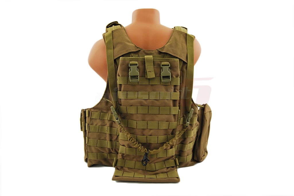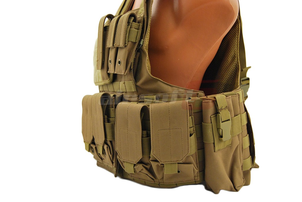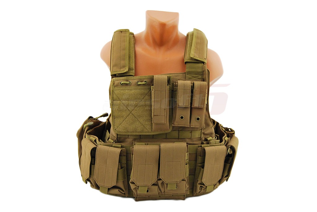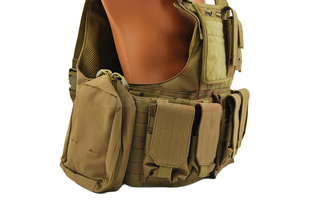 In pachet sunt incluse: 6 buzunare port incarcatoare replica principala, 2 buzunare duble port incarcatoare replica principala, un admin pouch, un buzunar mare cu carabina, un hydration bag mare pentru spate, curea pentru replica. Aceasta vesta este dotata cu un sistem de detasare rapida, iar actionarea este precum cea a vestei originale in partea lateral inferioara.