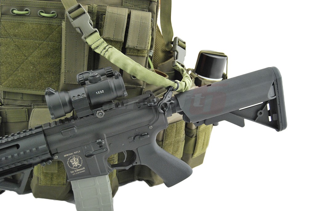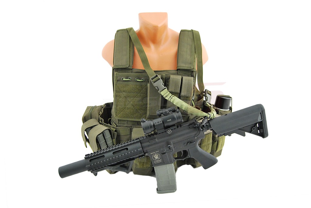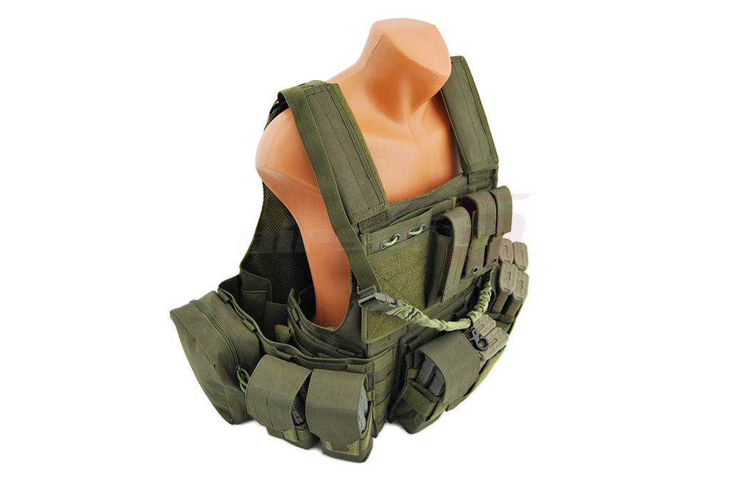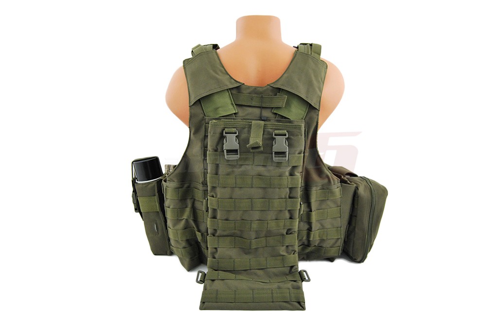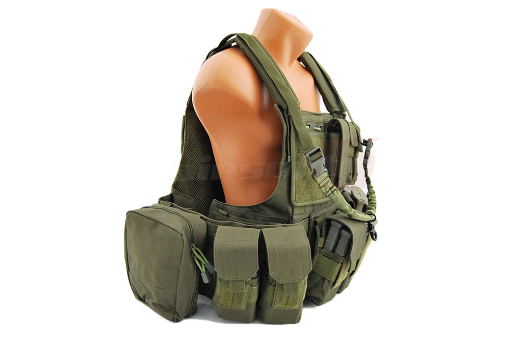In pachet sunt incluse: 6 buzunare port incarcatoare replica principala, 2 buzunare duble port incarcatoare replica principala, un admin pouch, un buzunar mare cu carabina, un hydration bag mare pentru spate, curea pentru replica. Aceasta vesta este dotata cu un sistem de detasare rapida, iar actionarea este precum cea a vestei originale in partea lateral inferioara.