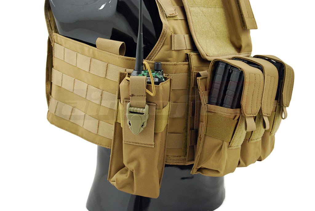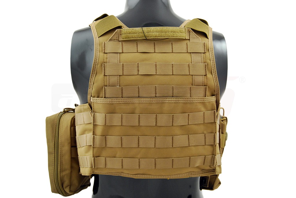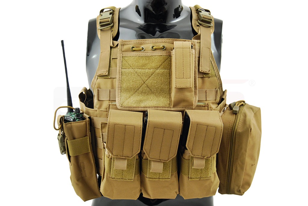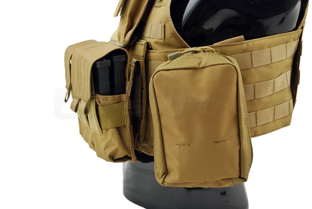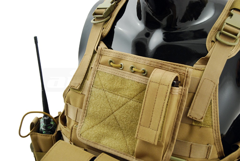 Aceasta vesta tactica este fabricata de 8Fields si este destinata airsoft-ului. Modelul reprodus este Cummerbund si la baza este un plate carrier prevazut cu sisteme de prindere molle. Aceste prinderi sunt amplasate pe o mare parte a suprafetei exterioare a vestei, permitand o buna accesorizare. Vesta este fabricata din nylon, si are grosimea de 600D. Prinderea vestei se realizeaza cu ajutorul unor sectiuni cu arici amplasate in partea frontala iar in partea din spate exista un sistem de reglaj pentru o fixare cat mai buna. Vesta este livrata impreuna cu un buzunar triplu, un buzunar utilitar, un buzunar admin si un buzunar pentru statie, buzunarele nu sunt fixate definitiv pentru a permite o relocare cat mai usoara. Va recomandam sa fixati corect sistemele de prindere molle.