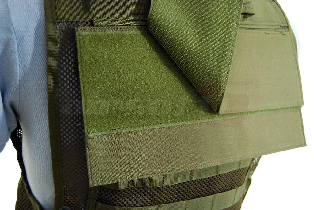 Sistemul de inchidere este alcatuit din fermoar si carabine din plastic. Tot in partea frontala exista doua compartimente accesibile cu fermoar iar in partea dorsala exista un spatiu accesibil prin o fanta superioara asigurata cu arici. In partea de jos a vestei existe sisteme de prindere pentru centura pentru a asigura mai bine pozitionarea vestei si pentru a contribui la sustinerea centurii atunci cand pe aceasta sunt montate tocuri sau alte accesorii ce o ingreuneaza. In partea superioara a spatelui exista un maner de tractiune in caz de necesitate. In zona pieptului prinderile molle au o usoara inclinatie permitand eficientizarea accesului la continutul eventualelor buzunare montate. Tot in zona pieptului exista sectiuni prevazute cu arici pentru a permite montarea ecusoanelor sau patch-urilor.