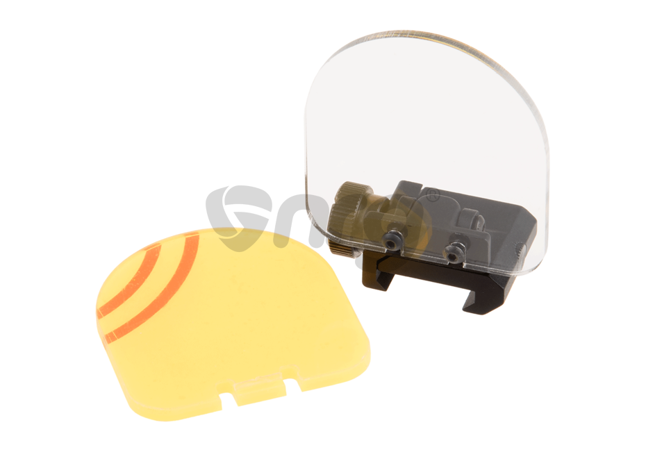 Acest dispozitiv deserveste la protejarea accesoriilor optice precum red-dot, lunete, reflex sight dar si altele. Suportul este realizat din metal iar geamul din policarbonat gros. In pachet exista doua culori de geamuri, galben si transparent. Dispozitivul se asigura usor, cu ajutorul surubului de mari dimensiuni.