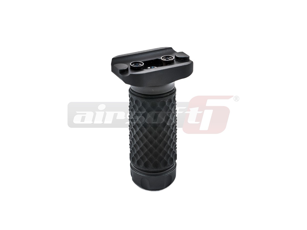 Maner vertical cu prindere pe keymod, fabricat din Aluminiu de calitate surub din metal. Este un maner de dimensiune mica dar extrem de confortabil pentru utilizator, datorita texturii sale aderente, permitand un grip foarte fix atat cu manusi cat si fara imbunatatind mult manevrabilitatea replicii in timpul actiunii. Se fixeaza cu ajutorul suruburilor din partea superioara care pentru demontare se slabesc si pentru fixare se strange. In interiorul sau exista un spatiu destinat depozitarii, acel spatiu este accesibil indepartand capacul inferior prin desfiletare. Capacul este din plastic.