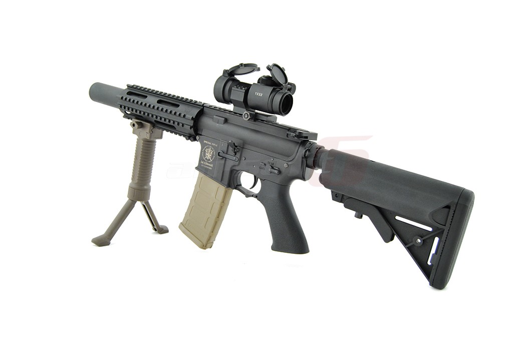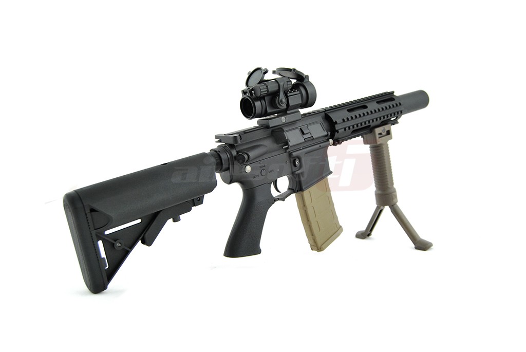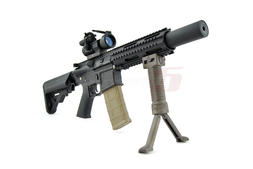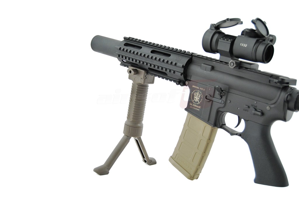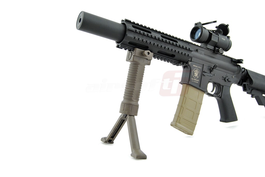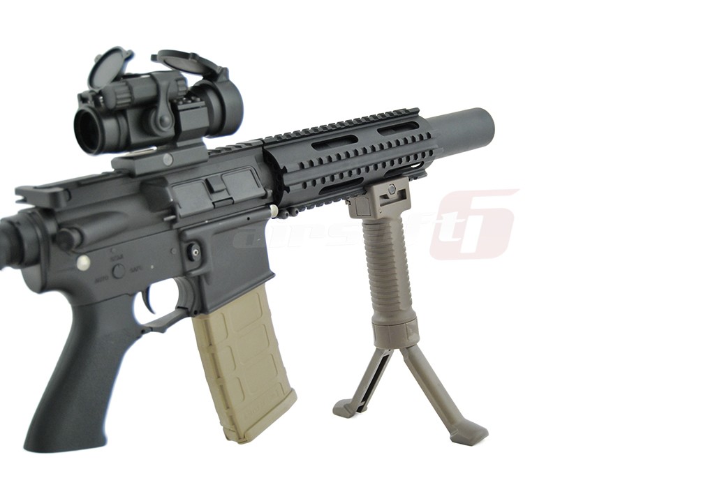 Acest maner joaca un rol dublu. Imbunatateste manevrabilitatea replicii iar cand situatia impune un foc de acoperire prelungit sustine replica in pozitie fixa pentru a oferi o baza stabila pentru o tinta precisa. Este fabricat din plastic ABS de calitate si se poate monta pe sine standard foarte usor. Pe lateral exista un surub mare pentru a putea fi actionat direct cu mana libera. Pentru actionarea bipodului trebuie apasat butonul existent in partea superioara. Odata apasat cu ajutorul unui arc interior cracanele sunt impinse in exterior. Pentru a strage in pozitia initiala manerul, cracanele trebuiesc introduse manual in interior pana la capat.