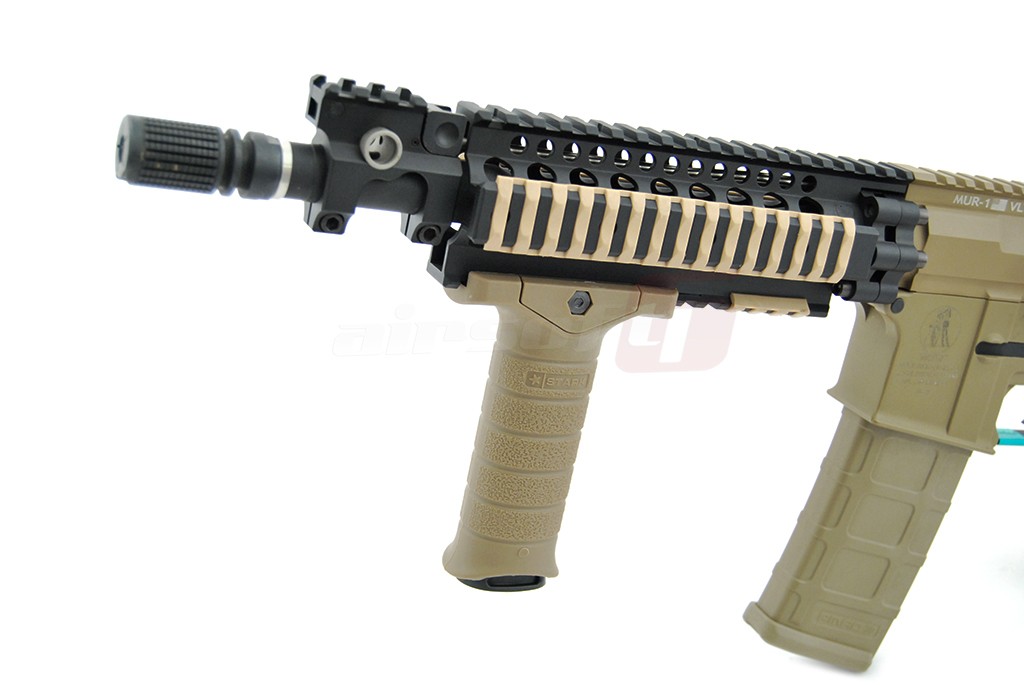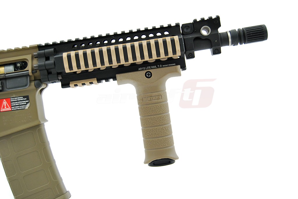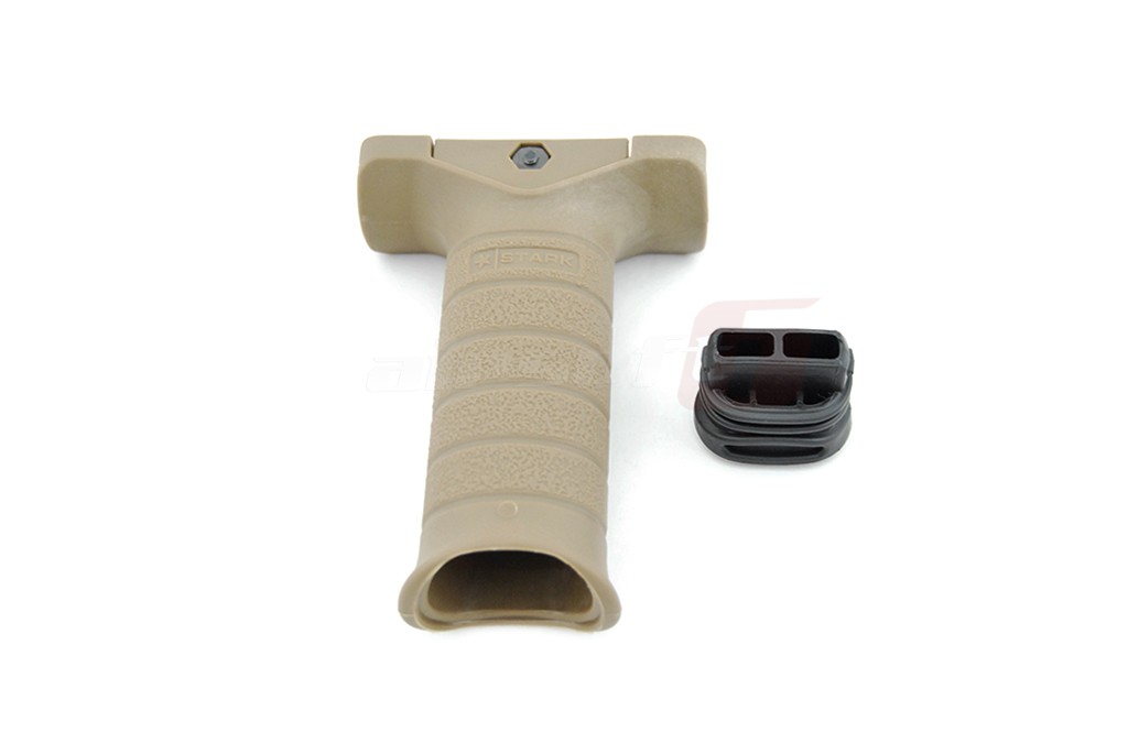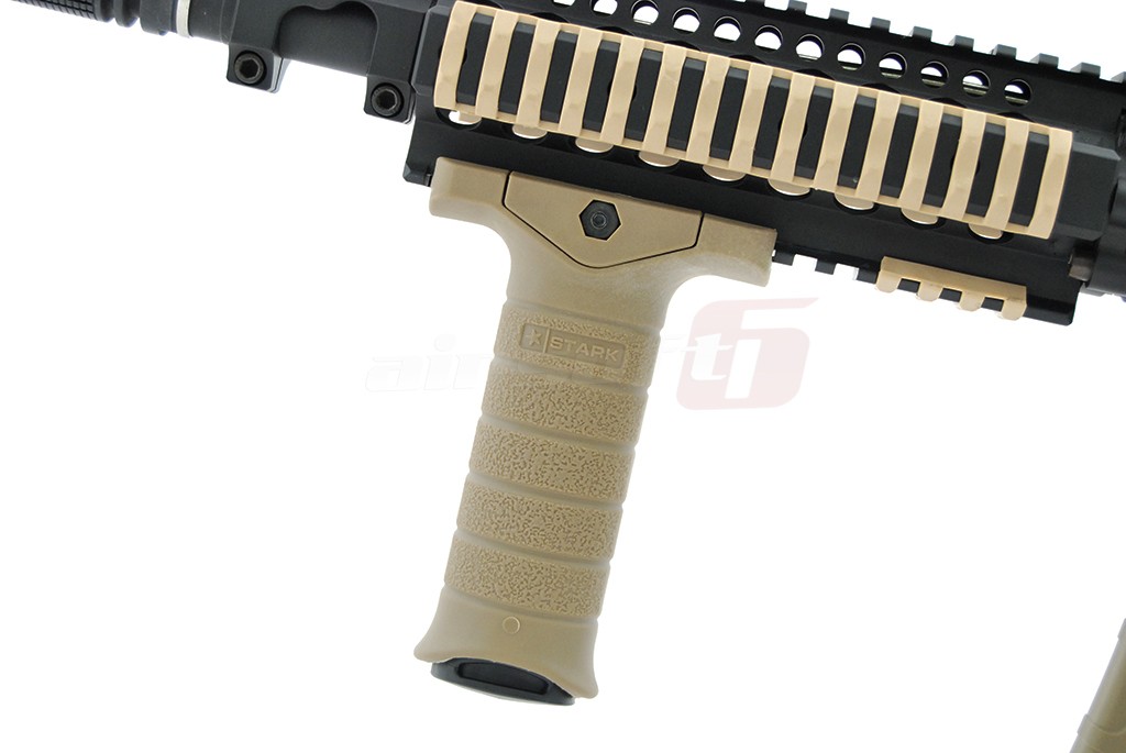 Maner vertical cu prindere pe sina clasica de 22mm fabricat din plastic ABS de calitate cu surub din metal. Este un maner mare dar totodata comformatbil pentru utilizator. Pe suprafata lui textura este poroasa mermitand un grip foarte fix atat cu manusi cat si fara imbunatatind mult manevrabilitatea replicii in timpul actiunii. Se fixeaza cu ajutorul surubului din partea superioara care pentru montare se slabeste si pentru fixare se strange. In interiorul sau exista un spatiu destinat depozitarii, acel spatiu este accesibil indepartand capacul inferior prin fortare. Capacul este din plastic moale.