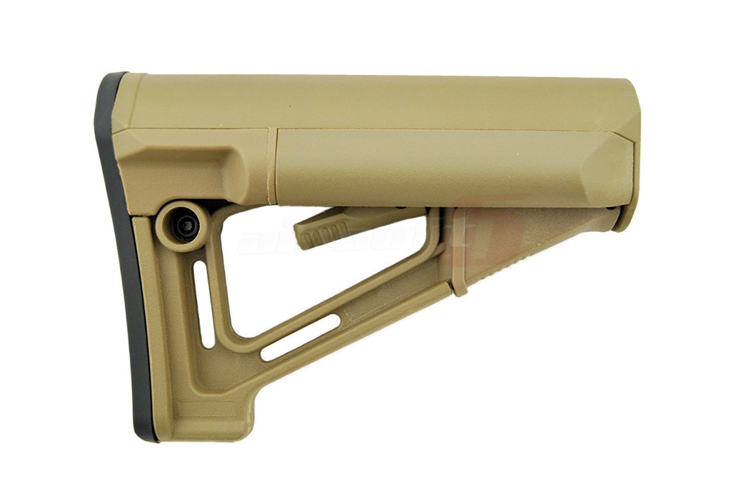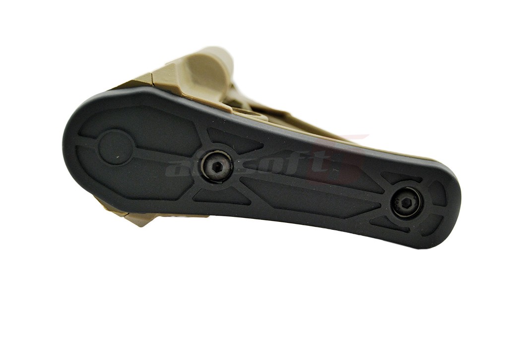 Acest pat este fabricat din plastic ABS de calitate rezistent la uzura. El se poate atasa oricarui tub pentru pat destinat modelelor M4 tip AEG. Designul este simplu si eficient si asemenea modelului real, patul prezinta doua spatii pentru depozitare, situate pe lateral si 2 sisteme de prindere QD ramforsate. Acest pat este prevazut cu un levier central pentru reglaj si o siguranta frontala pentru levierul de reglaj. In partea din spate exista un suport din cauciuc detasabil, menit sa imbunatateasca confortul si sa mareasca aderenta.