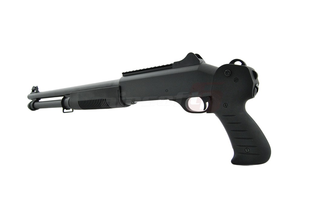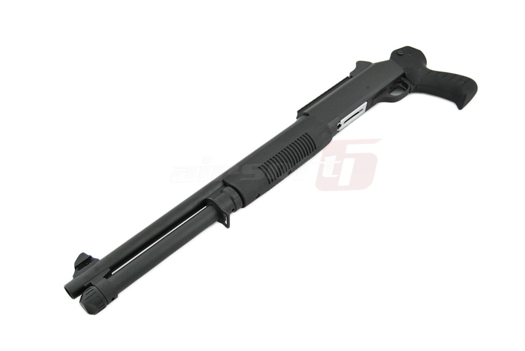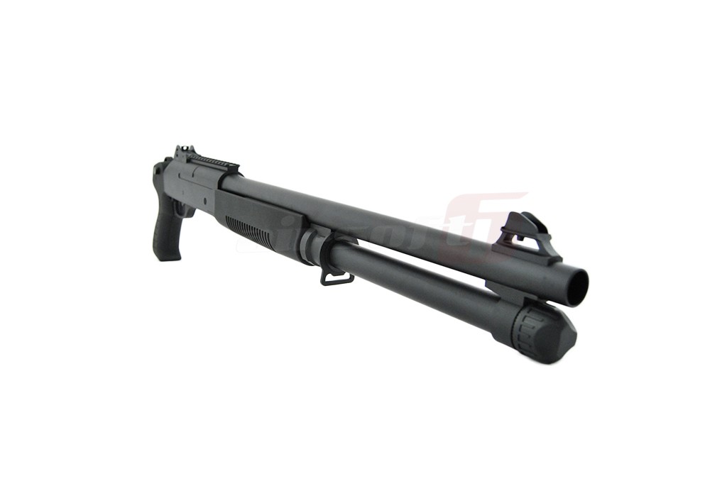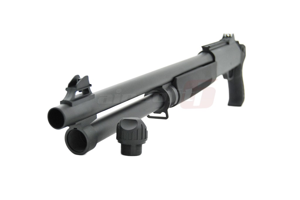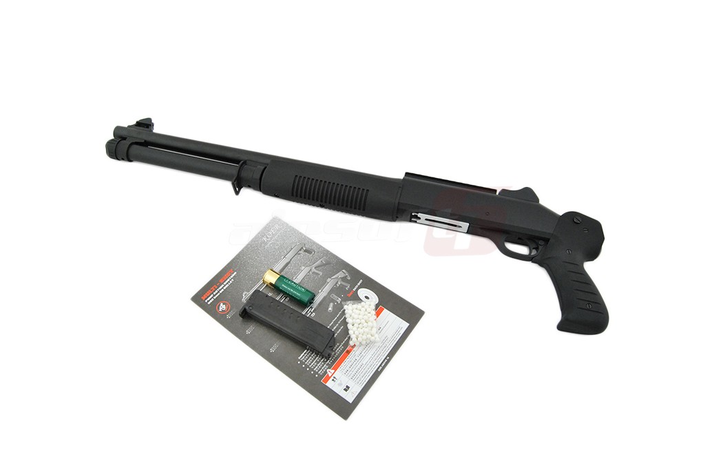 In constructia replicii de airsoft a fost folosit atat plasticu ABS pentru corpul principal cat si aluminiu pentru tevile externe si anumite componente cheie interne. Anumite elemente precum mansonul si manerul sunt acoperite cu un strat cauciucat pentru o aderenta mai buna. Principiul de functionare a replicii este asemanator armei adevarate. Pentru fiecare foc trebuie armat mansonul din partea fronatala a replicii. Odata armata, replica de airsoft este capabila sa actioneze 3 bile simultan avantajand astfel utilizatorul in abordarea mai multor tinte.