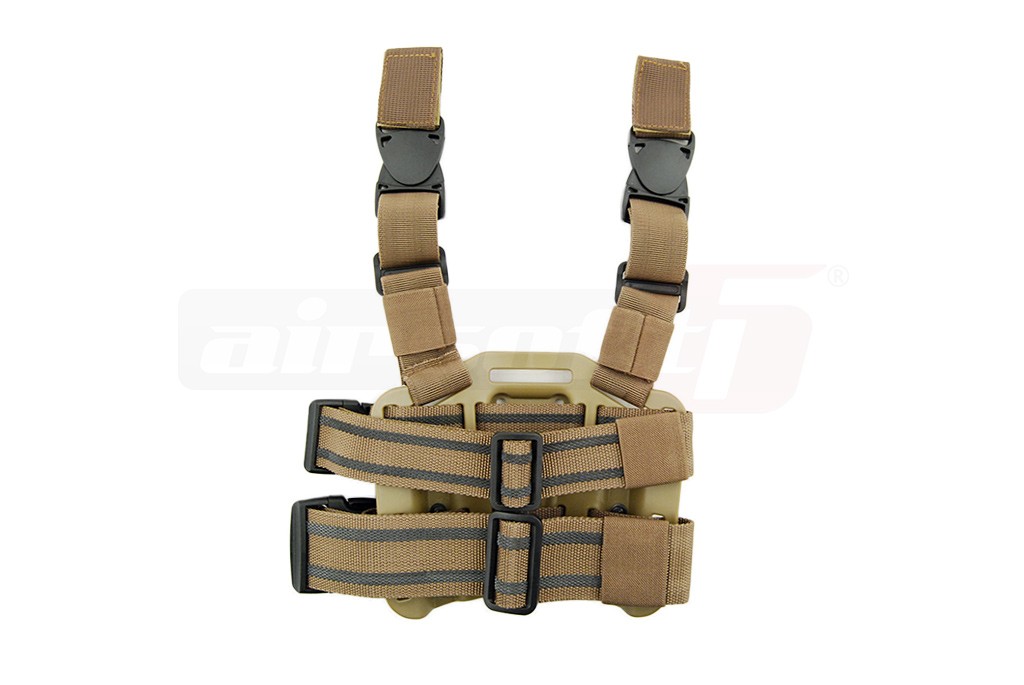 Toc pentru pistol Glock dar si alte derivate asemanatoare ca forma. Avantajele de baza al acestui toc sunt posibilitatea de fixare ferma pe picior datorita platformei rigide si modularitatea oferita de componentele aflate in pachet. In partea superioara tocul se asigura de centura cu ajutorul a doua chingi reglabile prevazute cu carabina cu detasare rapida din plastic. Partea inferioara se asigura tot cu ajutorul a doua chingi din nylon moale deasemenea reglabile si prevazute cu carabina din plastic. Replica este bine fixata in tocul propriu-zis datorita formei fixe iar ca asigurare exista o clapeta in dreptul ltragaciului ce face aproape imposibil extractia pistolului fara actionarea acestei piedici. In pachet sunt incluse si doua prinderi ce permit fixarea tocului direct pe centura de la pantaloni. Tocul pistolului se fixeaza pe prinderi cu ajutorul a 3 suruburi. In pachet mai exista inca doua suporturi pentru incarcator si pentru o eventuala lanterna. Aceste doua suporturi se fixeaza pe sinele laterale ale platformei.