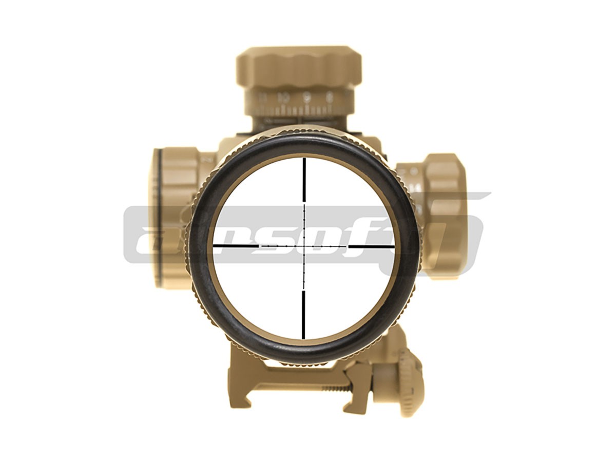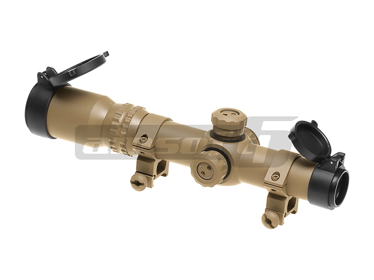 Aceasta luneta prezinta zoom variabil de la 1x la 4x. Reglajul lunetei poate fi usor realizat cu ajutorul butoanelor de dimensiuni mari iar odata realizat acest reglaj, poate fi asigurat cu ajutorul functiei de blocare a butoanelor. In pachet exista 2 inele joase pentru a permite fixarea pe sine standard. Pentru protectia lentilelor in timpul transportului in pachet exista 2 capace de protectie. In timpul utilizarii aceste capace trebuiesc indepartate deoarece distorsioneaza imaginea.