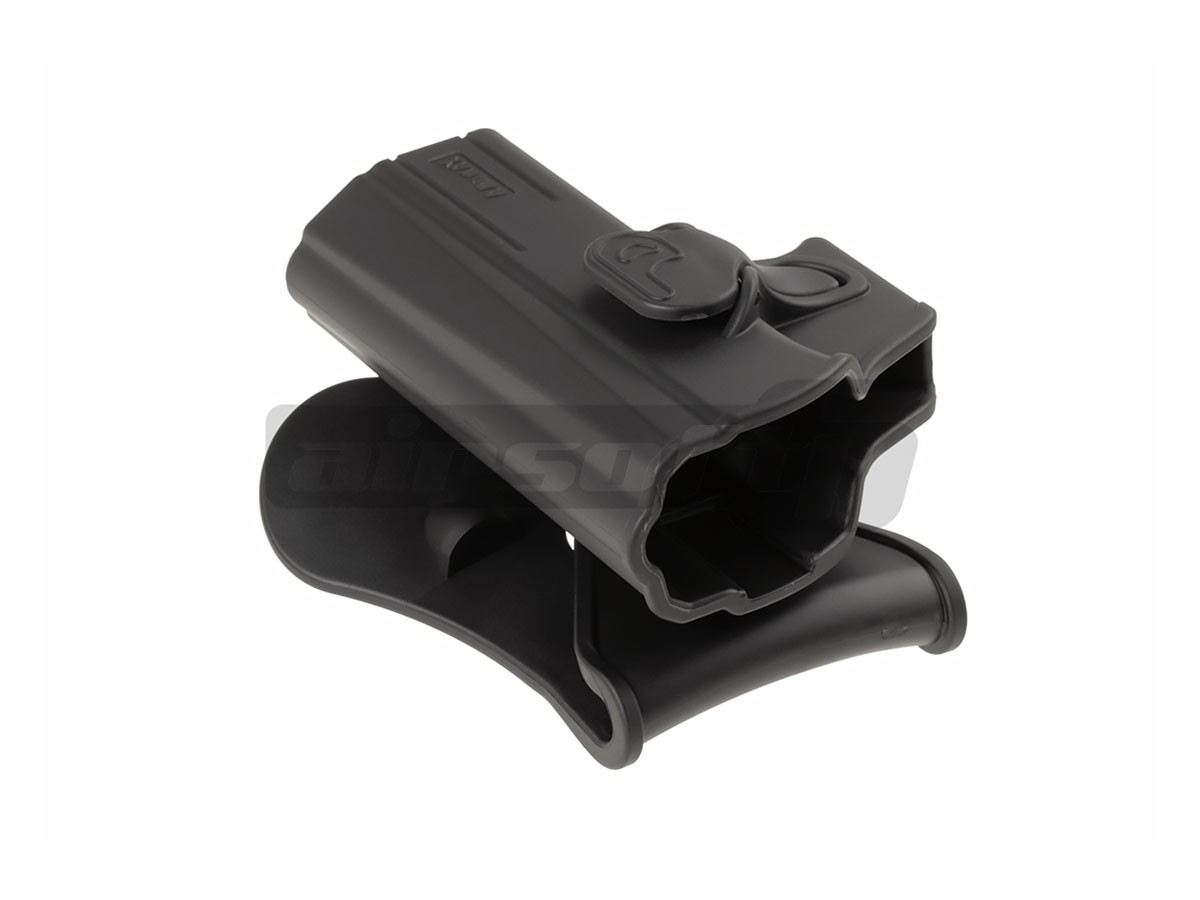 Avem placerea de a va prezenta tocul de pistol Amomax destinat platformei CZ Shadow 2. Acest toc este gandit pentru atasarea direct pe centura sau pe echipamente tactice prevazute cu sisteme de prindere molle cu ajutorul unui adaptor. Este un toc rigid, fabricat din polimer plastic iar asigurarea pistolului in pozitie se realizeaza cu ajutorul unui buton de mari dimensiuni, usor accesibil. Avantajul acestui toc este usurinta de exploatare. Se fixeaza rapid pe centura iar odata fixat, introducerea si extragerea pistolului este extrem de rapida dar totodata sigura.Acest toc ofera posibilitatea de rotire a intregului ansamblu 360°.