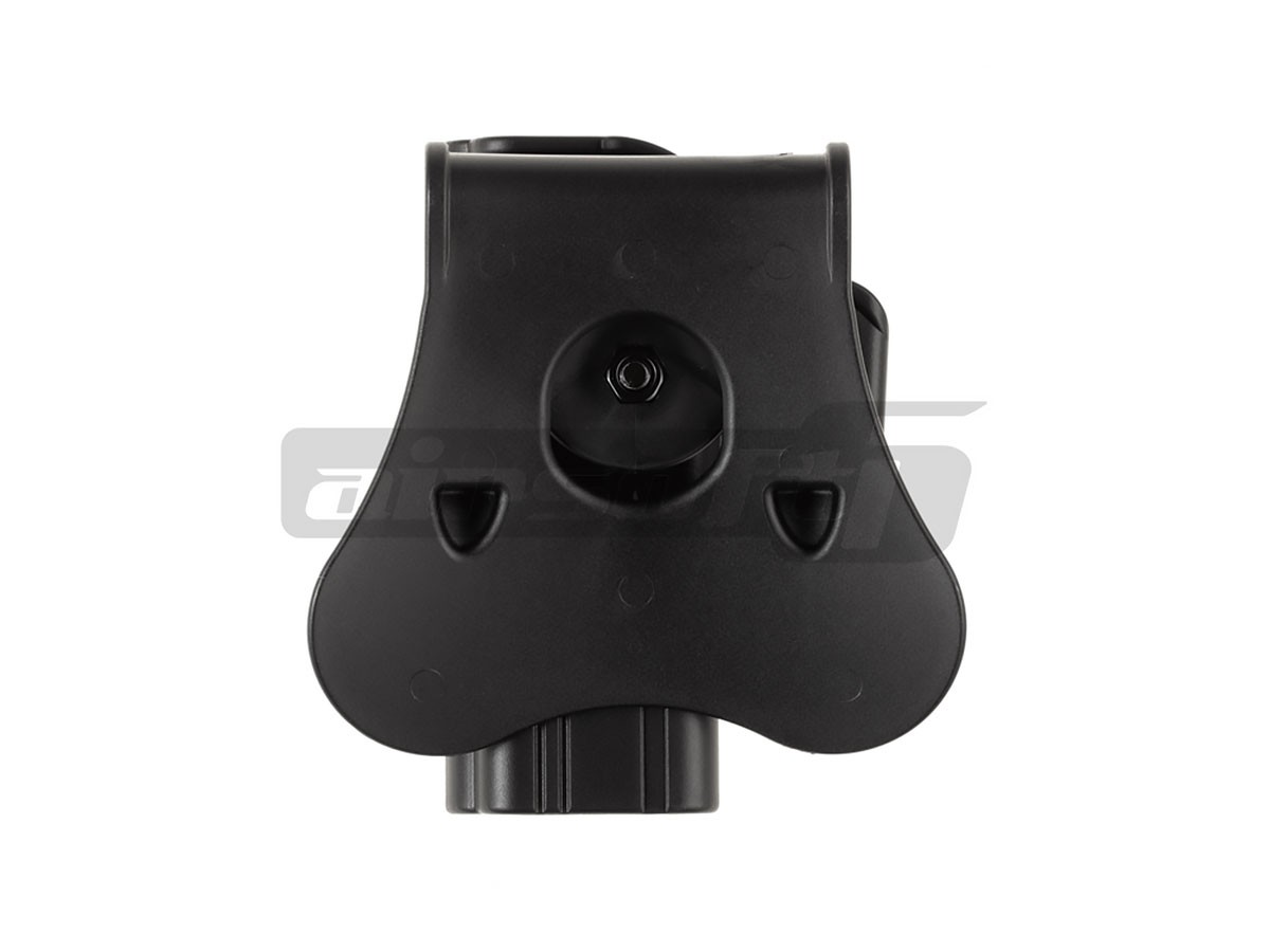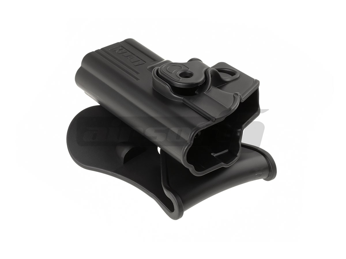 Avem placerea de a va prezenta tocul de pistol Amomax destinat platformelor G17-18C. Acest toc este gandit pentru atasarea direct pe centura sau pe echipamente tactice prevazute cu sisteme de prindere molle cu ajutorul unui adaptor. Este un toc rigid, fabricat din polimer plastic iar asigurarea pistolului in pozitie se realizeaza cu ajutorul unui buton de mari dimensiuni, usor accesibil. Avantajul acestui toc este usurinta de exploatare. Se fixeaza rapid pe centura iar odata fixat, introducerea si extragerea pistolului este extrem de rapida dar totodata sigura.Acest toc ofera posibilitatea de rotire a intregului ansamblu 360°.