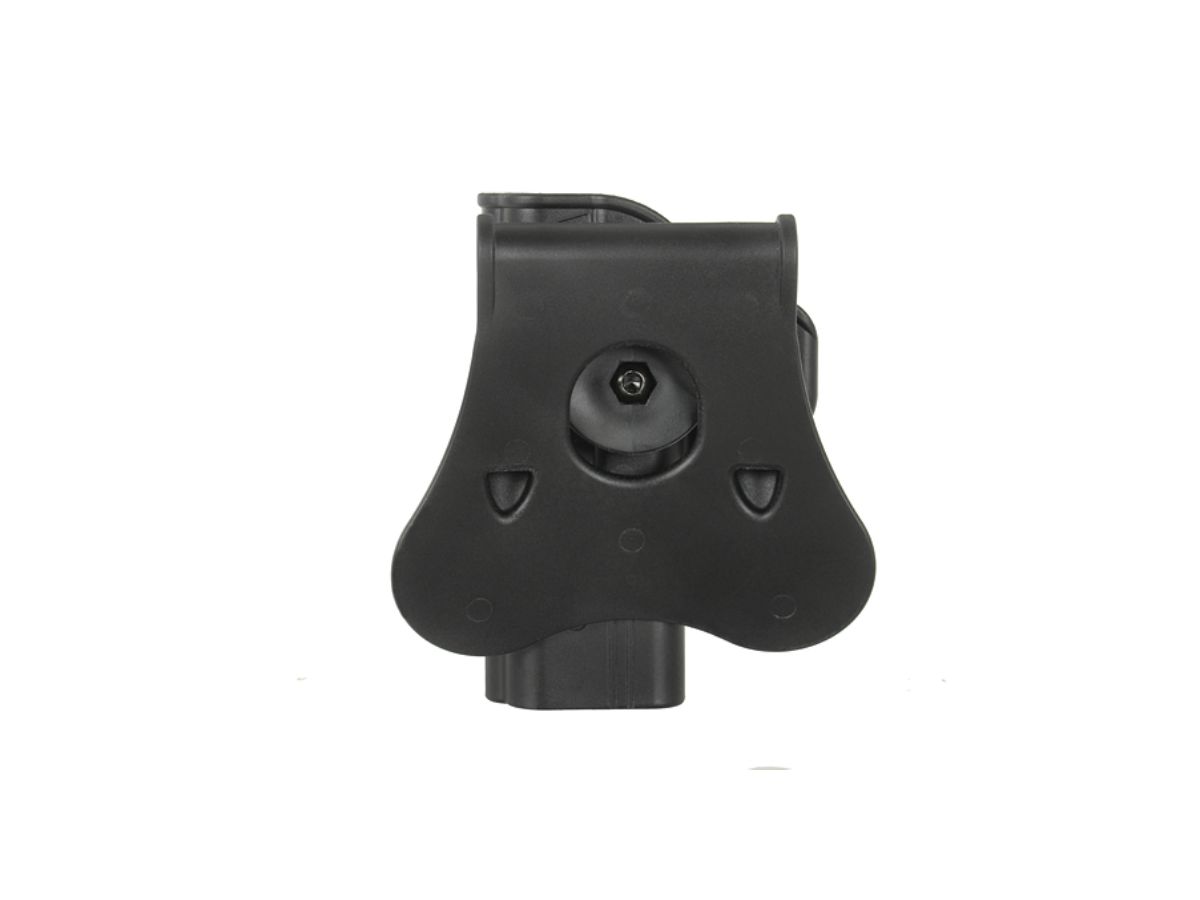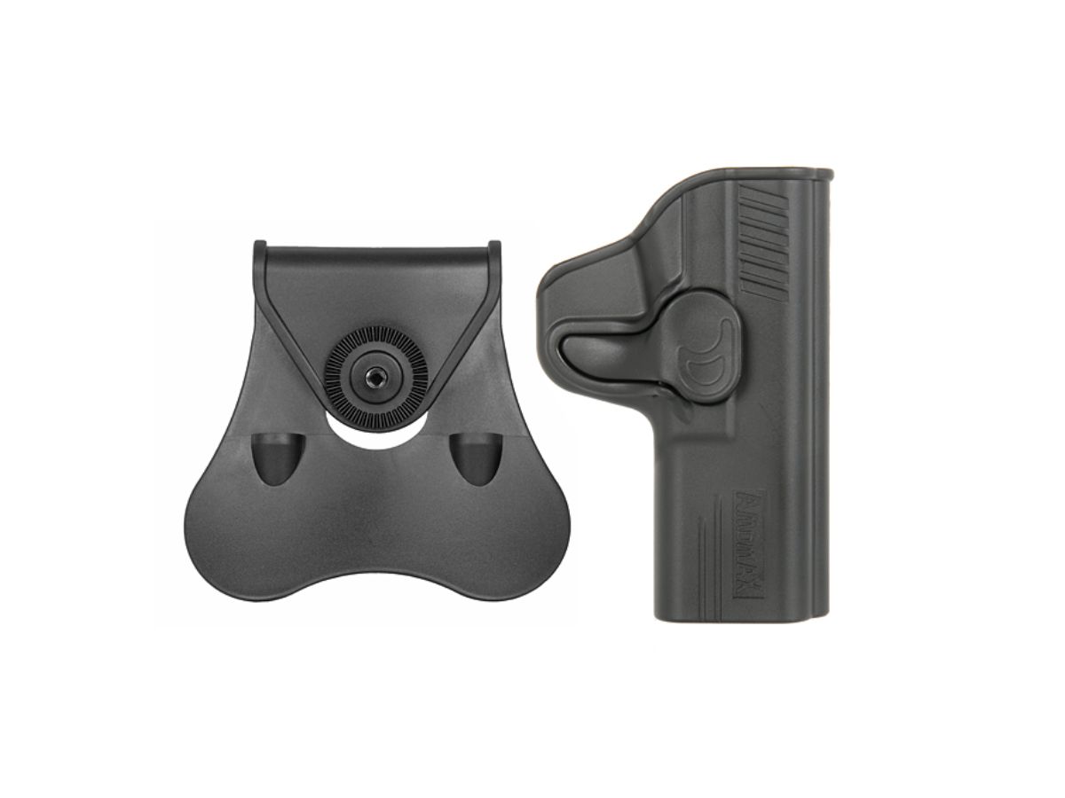 Avem placerea de a va prezenta tocul de pistol Amomax destinat platformelor M&P 9. Acest toc este gandit pentru atasarea direct pe centura sau pe echipamente tactice prevazute cu sisteme de prindere molle cu ajutorul unui adaptor. Este un toc rigid, fabricat din polimer plastic iar asigurarea pistolului in pozitie se realizeaza cu ajutorul unui buton de mari dimensiuni, usor accesibil. Avantajul acestui toc este usurinta de exploatare. Se fixeaza rapid pe centura iar odata fixat, introducerea si extragerea pistolului este extrem de rapida dar totodata sigura.Acest toc ofera posibilitatea de rotire a intregului ansamblu 360°.