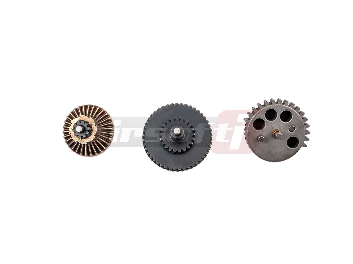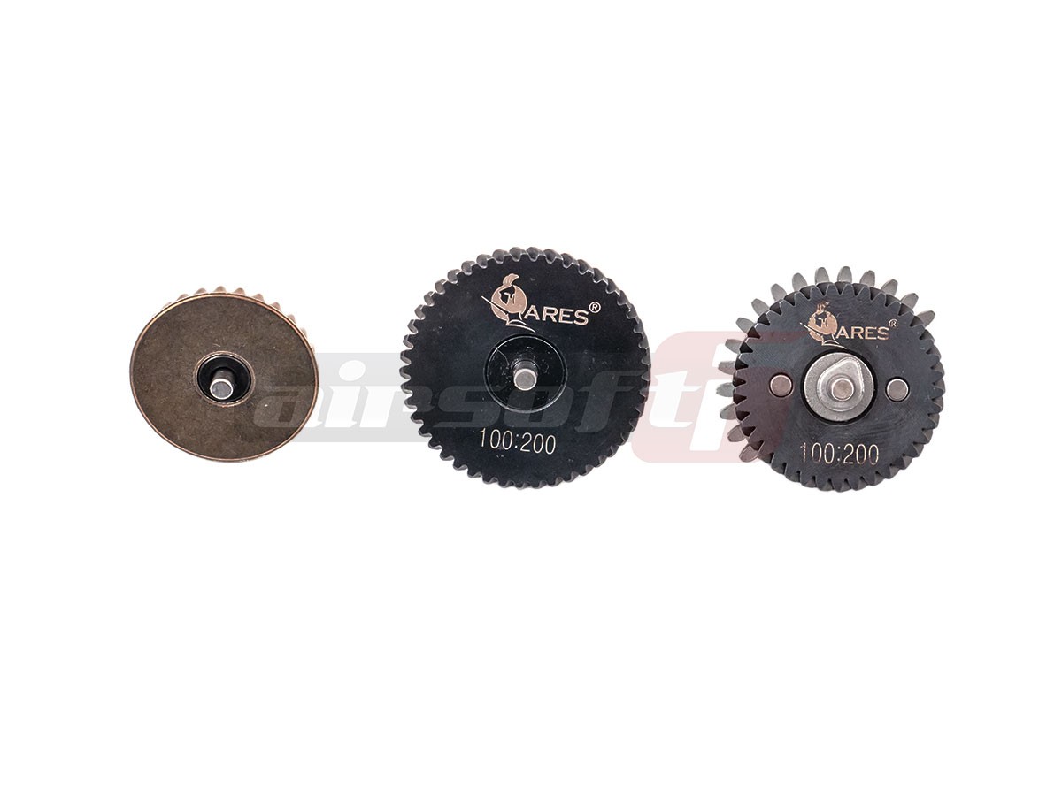 Roti high torque marca Ares. Fabricate din otel de calitate. Aceste roti au un raport de 100:200 obtinand astfel cu aceleasi turatii ale motorului existent o cadenta de tir mai mica dar o putere de comprimare a arcului mai mare. Oferind o sansa se succes amatorilor clasei DMR, unde viteza bilei trebuie sa fie ceva mai mare.