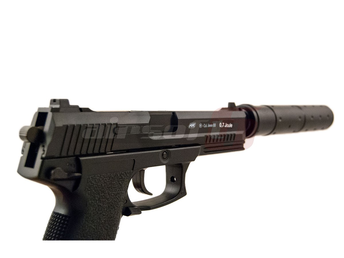Aceasta replica fabricata de ASG copiaza pistolul MK23 oferit de Heckler & Koch. In constructia acestui pistol este folosit preponderent plasticul si in anumite cazuri in mecanismele interne metalul. Designul acestei replici copiaza in mare parte arma reala, mai putin faptul ca nu are recul. Siguranta este in partea din spate si este ambidextra. Slide-catch-ul functioneaza si chiar si slide-ul culiseaza spre inapoi, aparent fara nici un rol. Butonul pentru eliberarea incarcatorului este sub garda tragaciului, asemenea armei reale si poate fi actionata pe ambele parti. In partea din fata exista o sina standard, atentie insa, nu picatinny.