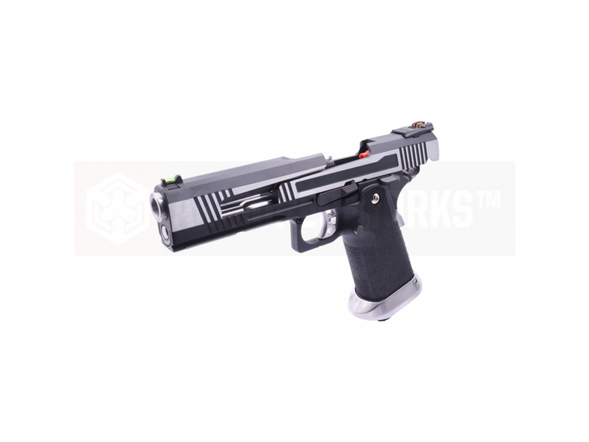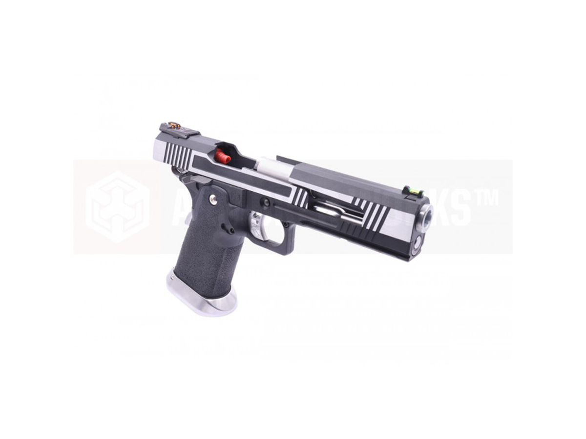 AW Custom HX1001 split slide ste construit aproape in intregime din metal, manerul fiind realizat din plastic iar toate elementele specifice hicapa sunt unde trebuie sa fie, piedica activa situata pe maner si siguranta pentru cocos, specifice clasicului 1911.