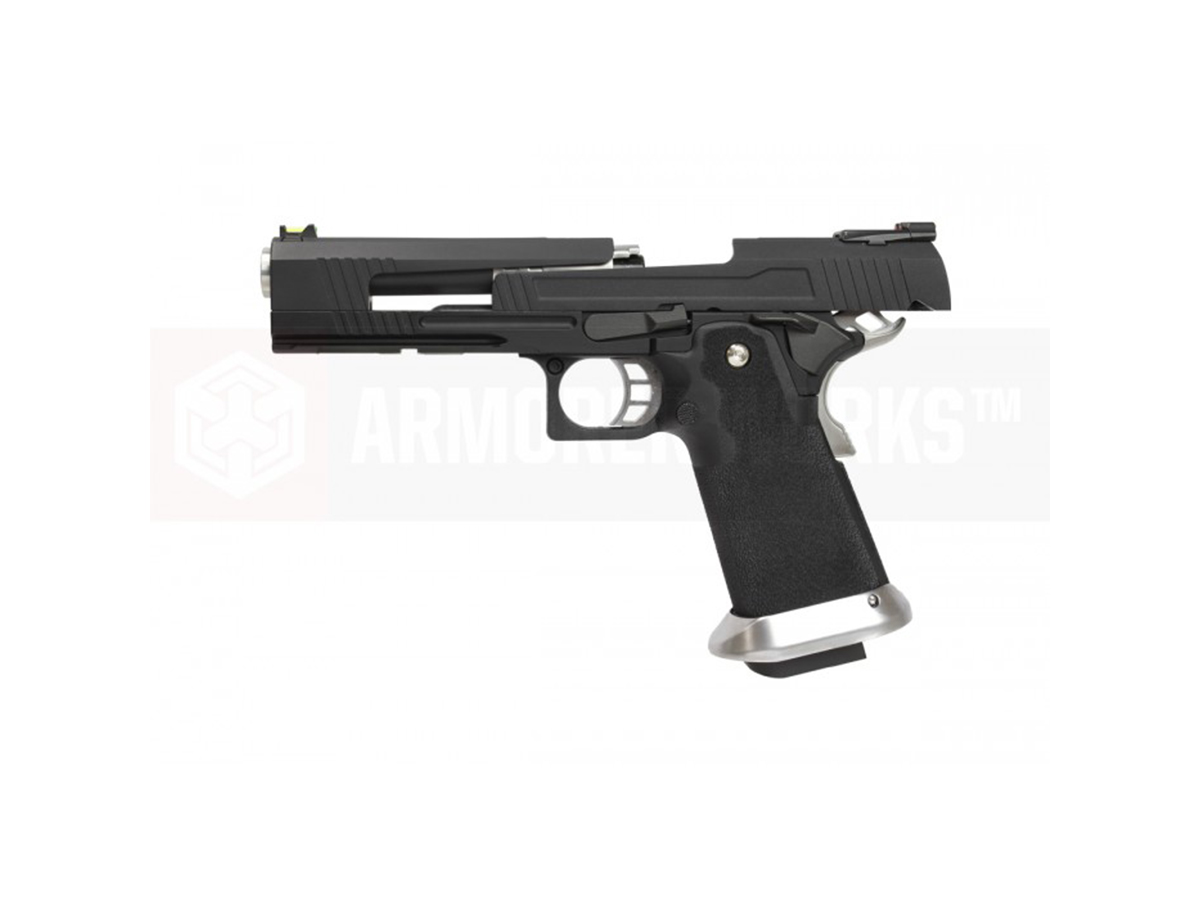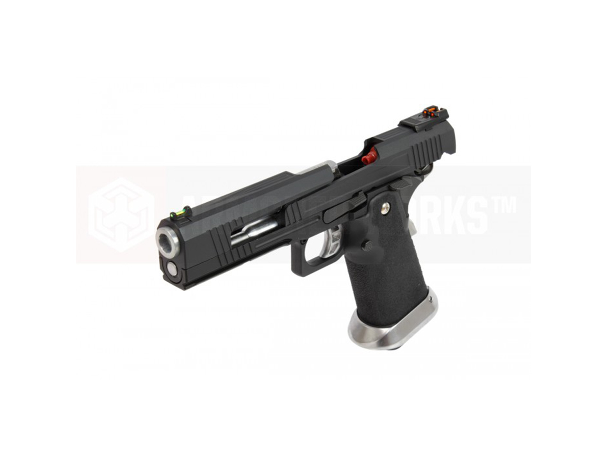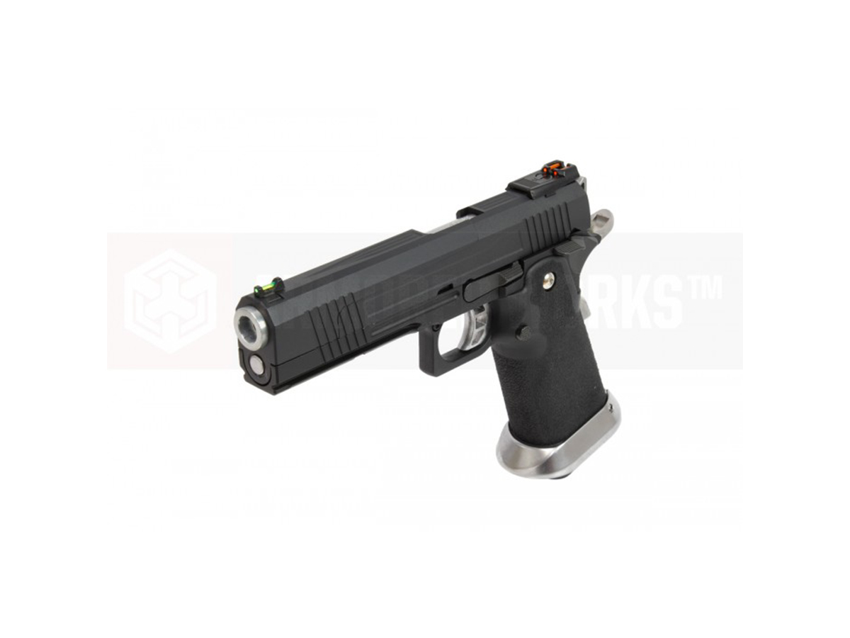 AW Custom HX1002 split slide ste construit aproape in intregime din metal, manerul fiind realizat din plastic iar toate elementele specifice hicapa sunt unde trebuie sa fie, piedica activa situata pe maner si siguranta pentru cocos, specifice clasicului 1911.