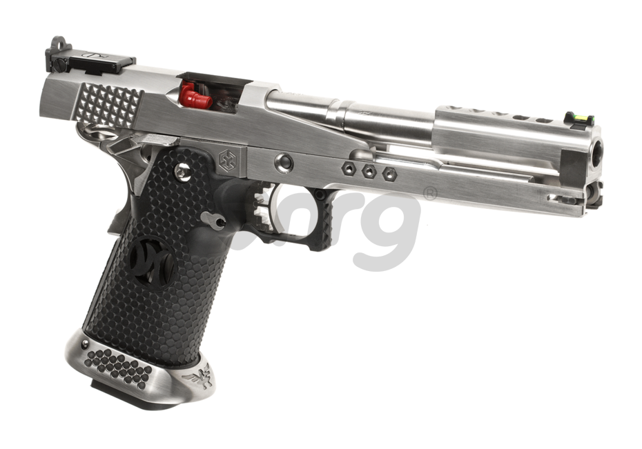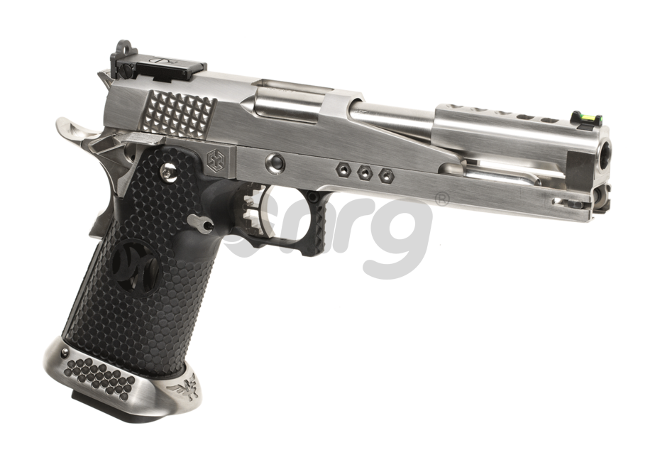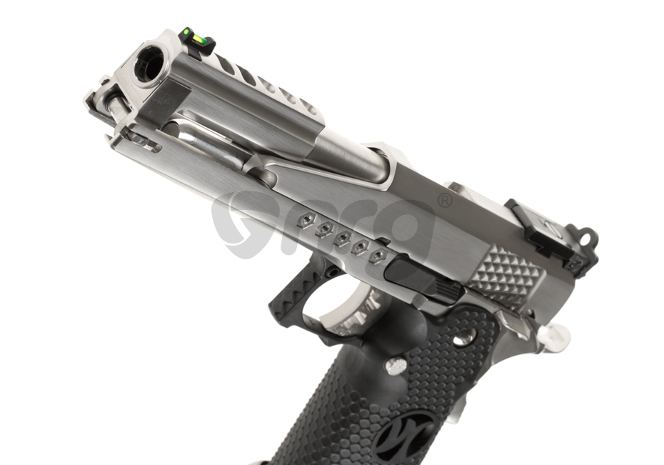 AW Custom HX2201 este construit aproape in intregime din metal, manerul fiind realizat din plastic iar toate elementele specifice hicapa sunt unde trebuie sa fie, piedica activa situata pe maner si siguranta pentru cocos, specifice clasicului 1911.