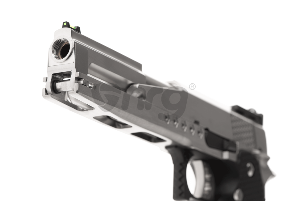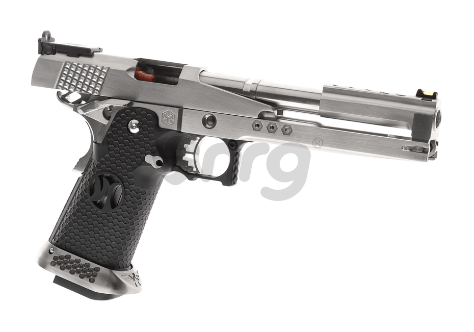 AW Custom HX2231 este construit aproape in intregime din metal, manerul fiind realizat din plastic iar toate elementele specifice hicapa sunt unde trebuie sa fie, piedica activa situata pe maner si siguranta pentru cocos, specifice clasicului 1911.