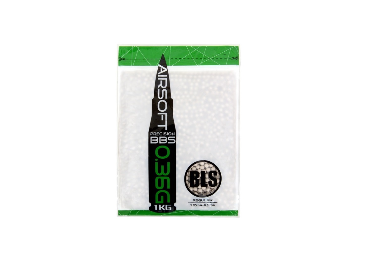 Bile pentru airsoft marca BLS. Aceste bile de culoare alba au o greutate de 0.36g si un diametru de 5.95 mm cu o abatere de 0.01 mm. Printr-un proces avansat de fabricatie, aceste bile au un finisaj foarte bun reducand astfel posibilitatea unei alimentari defectuoase si imbunatatind alunecarea pe teava interna, imbunatatind precizia replicii considerabil.