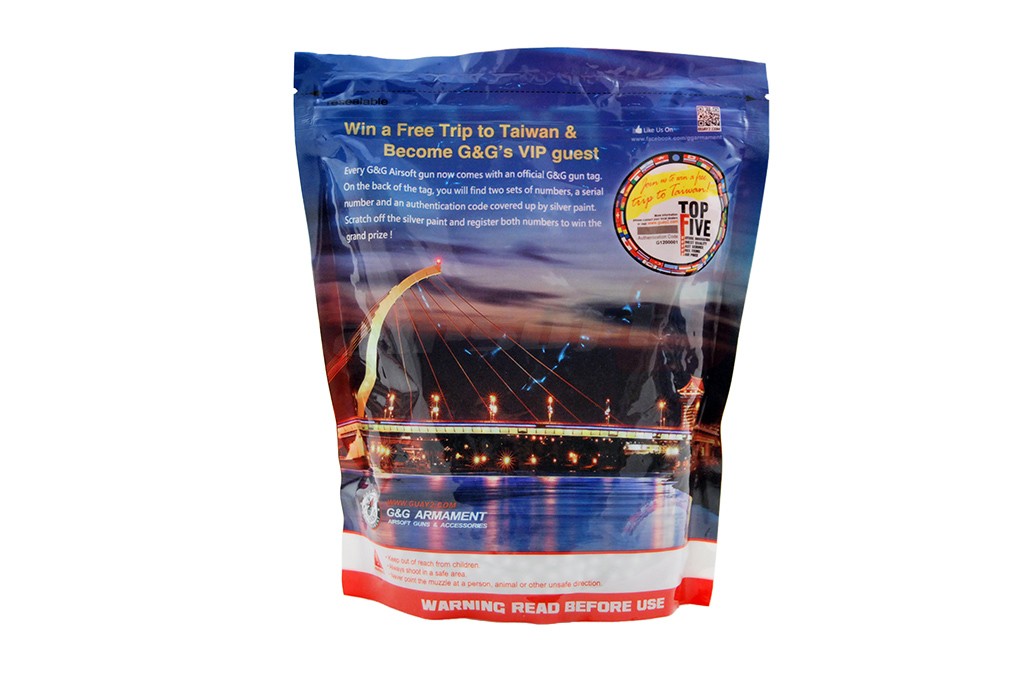 Bile pentru airsoft marca G&G. Aceste bile de culoare alba au o greutate de 0.20g si un diametru de 5.95 mm cu o abatere de 0.01 mm. Printr-un proces avansat de fabricatie, aceste bile au un finisaj foarte bun reducand astfel posibilitatea unei alimentari defectuoase si imbunatatind alunecarea pe teava interna, imbunatatind precizia replicii considerabil.
