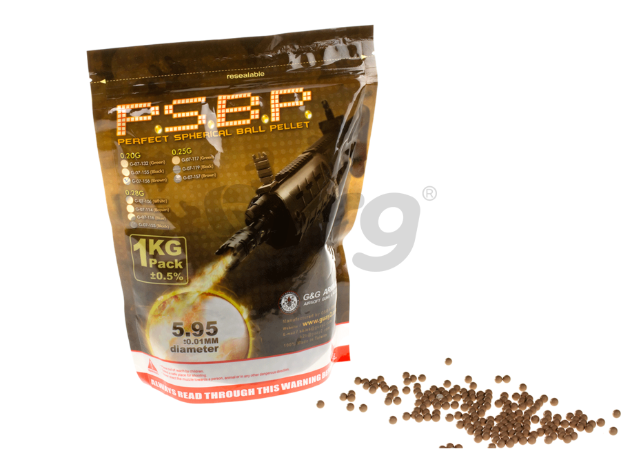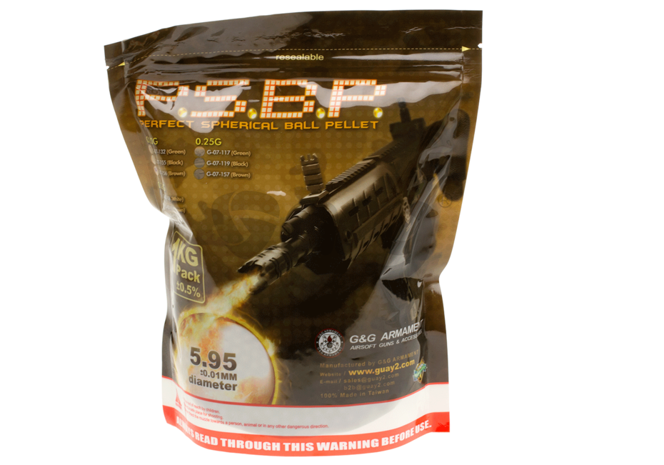 Bile pentru airsoft marca G&G. Aceste bile de culoare maro au o greutate de 0.20g si un diametru de 5.95 mm cu o abatere de 0.01 mm. Printr-un proces avansat de fabricatie, aceste bile au un finisaj foarte bun reducand astfel posibilitatea unei alimentari defectuoase si imbunatatind alunecarea pe teava interna, imbunatatind precizia replicii considerabil.