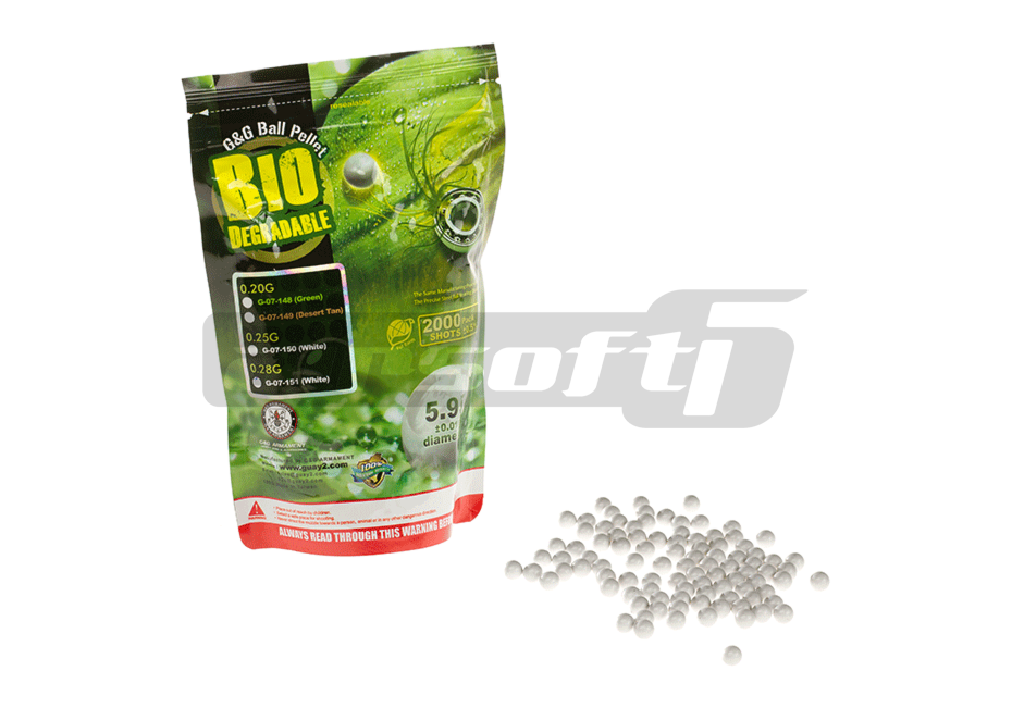 Din categoria "Salvati Planeta" avem bile marca G&G. Aceste bile sunt fabricate din compusi organici nontoxici astfel in anumite conditii de temperatura si umiditate se descompun fara urme. Finisarea acestor bile este extraordinara, luciul obtinut in urma numeroaselor procese de slefuire, este unul aproape perfect. Alimentarea cu bile a replicii este fara probleme iar alunecarea pe teava interna este cat se poate de lina. Bilele au o greutate de 0.28g si o abatere a diametrului de 0.01mm. Precizia obtinuta prin folosirea acestor bile este una foarte buna datorata consistentei materialului din care sunt fabricate.