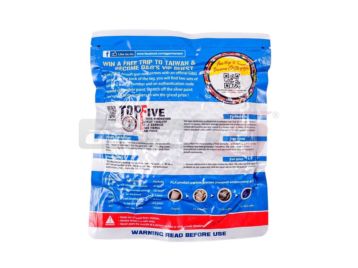 Din categoria "Salvati Planeta" avem bile marca G&G. Aceste bile sunt fabricate din compusi organici nontoxici astfel in anumite conditii de temperatura si umiditate se descompun fara urme. Finisarea acestor bile este extraordinara, luciul obtinut in urma numeroaselor procese de slefuire, este unul aproape perfect. Alimentarea cu bile a replicii este fara probleme iar alunecarea pe teava interna este cat se poate de lina. Bilele au o greutate de 0.28g si o abatere a diametrului de 0.01mm. Precizia obtinuta prin folosirea acestor bile este una foarte buna datorata consistentei materialului din care sunt fabricate.