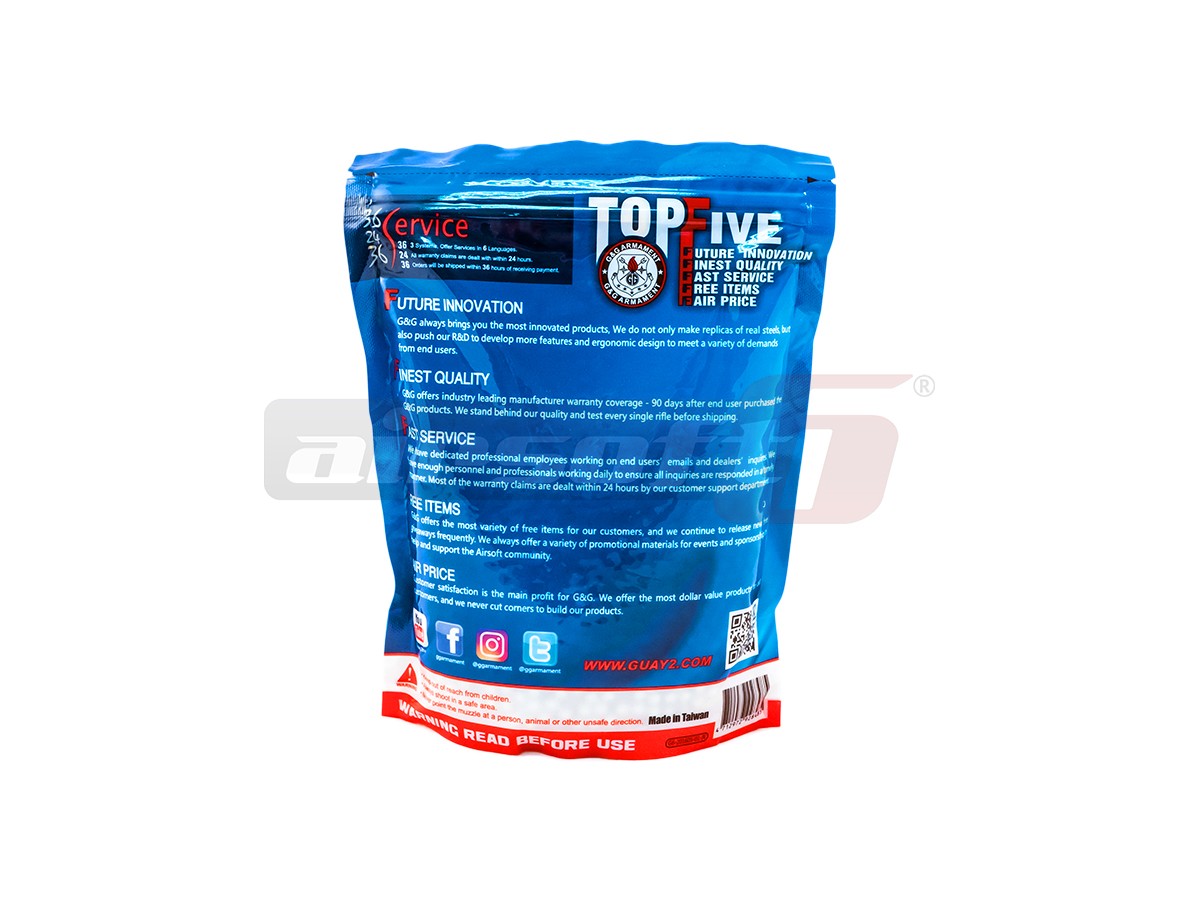 Bile pentru airsoft marca G&G. Aceste bile de culoare alba au o greutate de 0.28g si un diametru de 5.95 mm cu o abatere de 0.01 mm. Printr-un proces avansat de fabricatie, aceste bile au un finisaj foarte bun reducand astfel posibilitatea unei alimentari defectuoase si imbunatatind alunecarea pe teava interna, imbunatatind precizia replicii considerabil.