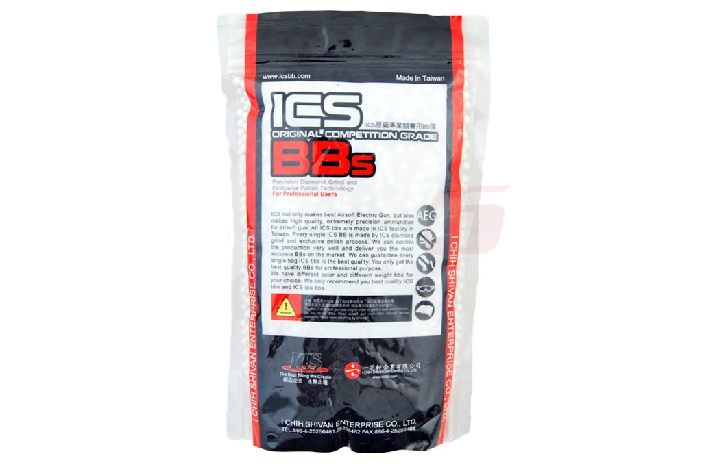 Bile pentru airsoft marca ICS. Aceste bile de culoare alba au o greutate de 0.25g si un diametru intre 5.92 si 5.98 mm. Finisajul bilelor este bun imbunatatind alimentarea in sistemul de preluare si impiedica depunerea de material pe interiorul tevii interne. Precizia acestor bile este buna.