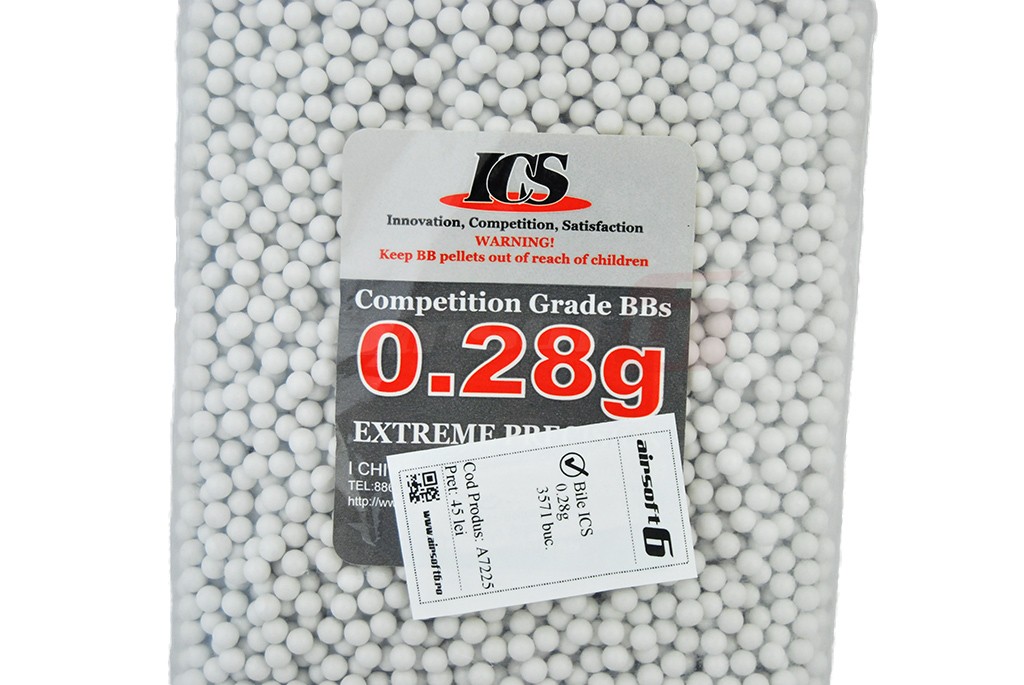 Bile pentru airsoft marca ICS. Aceste bile de culoare alba au o greutate de 0.28g si un diametru intre 5.92 si 5.98 mm. Finisajul bilelor este bun imbunatatind alimentarea in sistemul de preluare si impiedica depunerea de material pe interiorul tevii interne. Precizia acestor bile este buna.