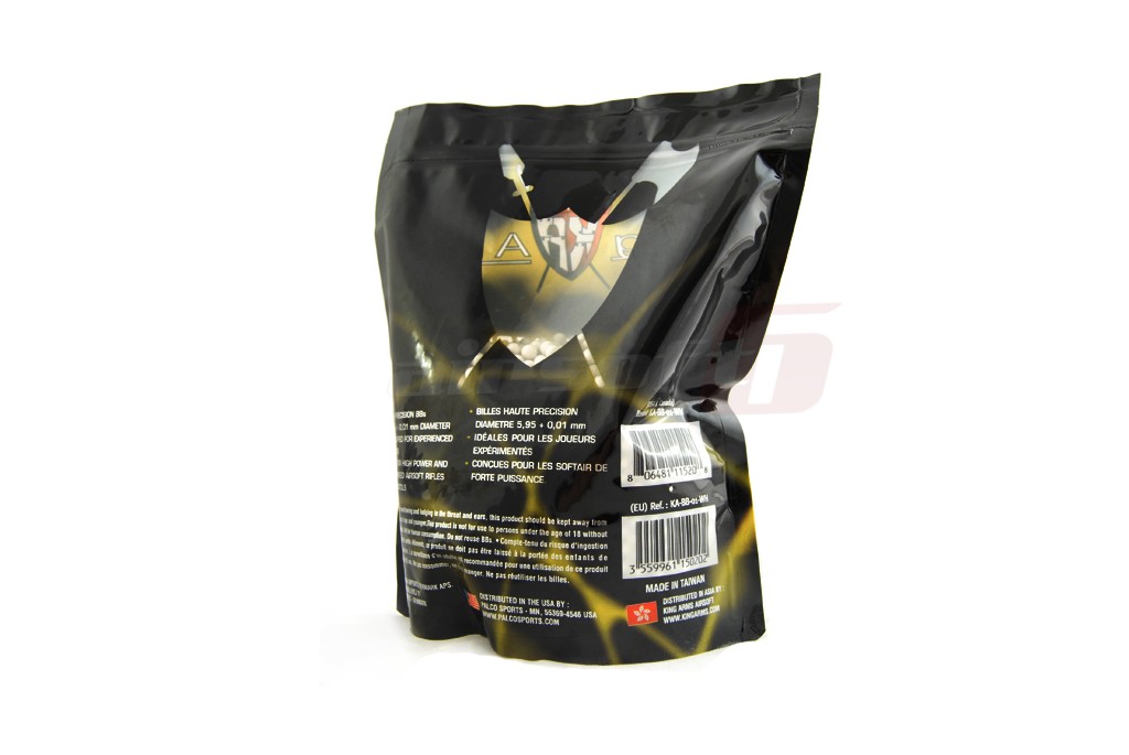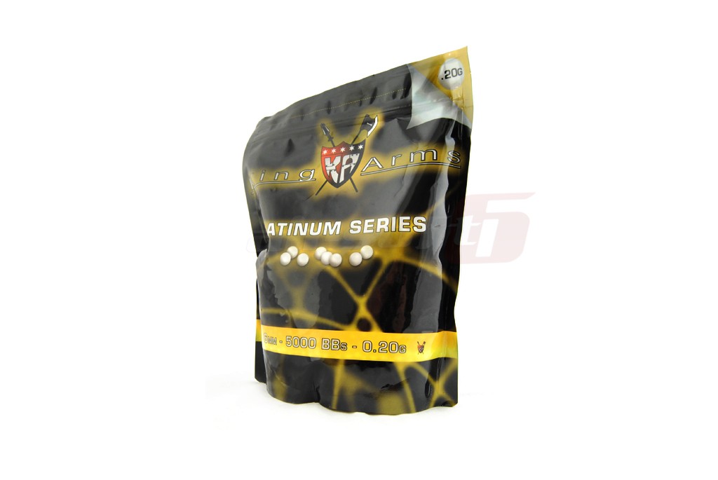 Bile de calitate superioara fabricate de King Arms. Aceste bile au o greutate de 0.20g si au o abatere a diametrului de 0.01 mm. Finisajul exterior este unul foarte bun. Acest aspect imbunatateste circularea bilelor in incarcatoare si camera de HopUp. Astfel alimentarea cu bile este lina. Precizia si grupajul sunt foarte bune. Bilele sunt ambalate in pungi de plastic resigilabile de 1Kg, adica aprox 5000 de bile.