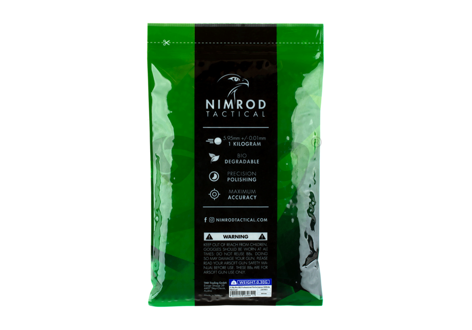 Bile de precizie Professional Performance fabricate de Nimrod. Bilele au o greutate de 0.30g si un diametru de 6 mm. Aceste bile sunt fabricate din compusi organici nontoxici astfel in anumite conditii de temperatura si umiditate se descompun fara urme. Finisarea acestor bile este extraordinara, luciul obtinut in urma numeroaselor procese de slefuire, este unul aproape perfect. Alimentarea cu bile a replicii este fara probleme iar alunecarea pe teava interna este cat se poate de lina. Precizia obtinuta prin folosirea acestor bile este una foarte buna datorata consistentei materialului din care sunt fabricate.