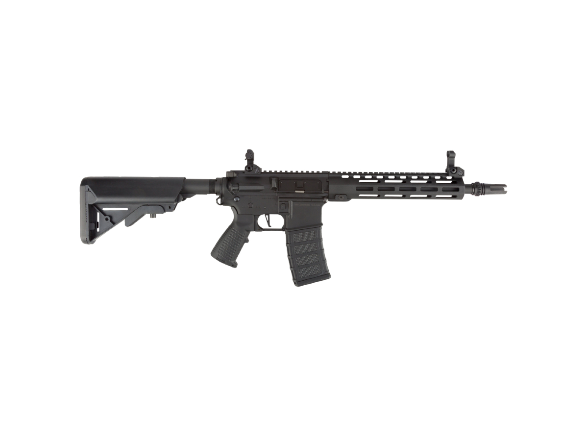 Replica de fata reprezinta modelul CA4 M10 M-Lok si este bazata pe arhicunoscuta platforma M4. Daca toata lumea M4, atunci de sa nu, inca una ? Corpul replicii este realizat din plastice moderne, contribuind la scaderea greutatii totale. Sistemul frontal de sine M-Lok este fabricat din aluminiu si permite astfel o vasta accesorizare. In partea superioara avem parte de o sina standard kilometrica pe care vom putea monta tot felul de dispozitive de ochire. Replica este livrata cu un sistem clasic de ochire, reglabil si rabatabil. Patul replicii este tip SOPMOD si reprezinta si spatiul de inmagazinare al acumulatorului.