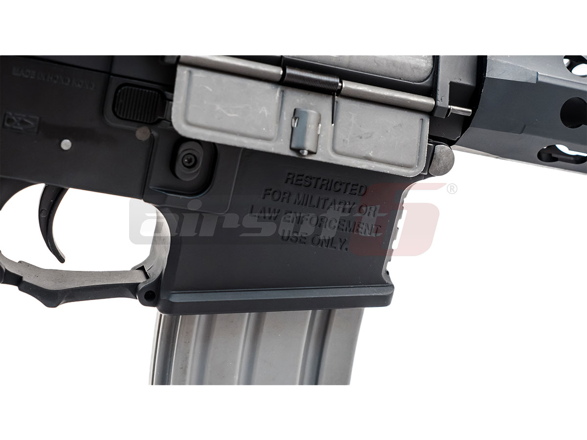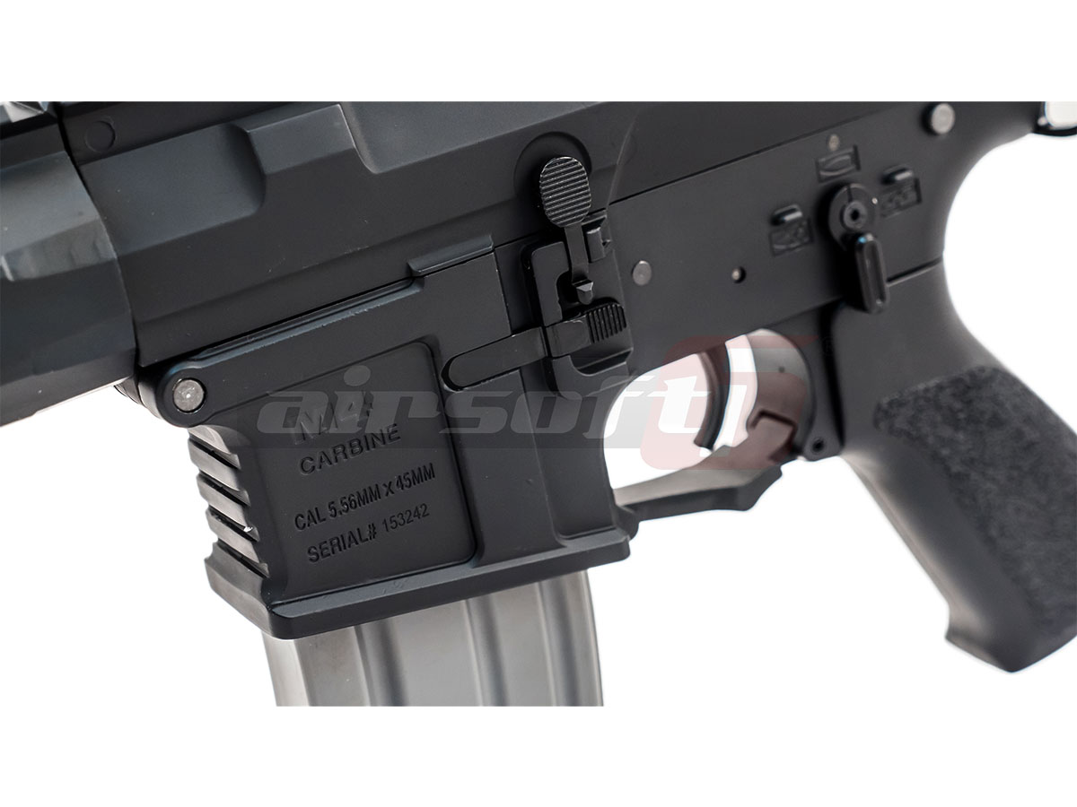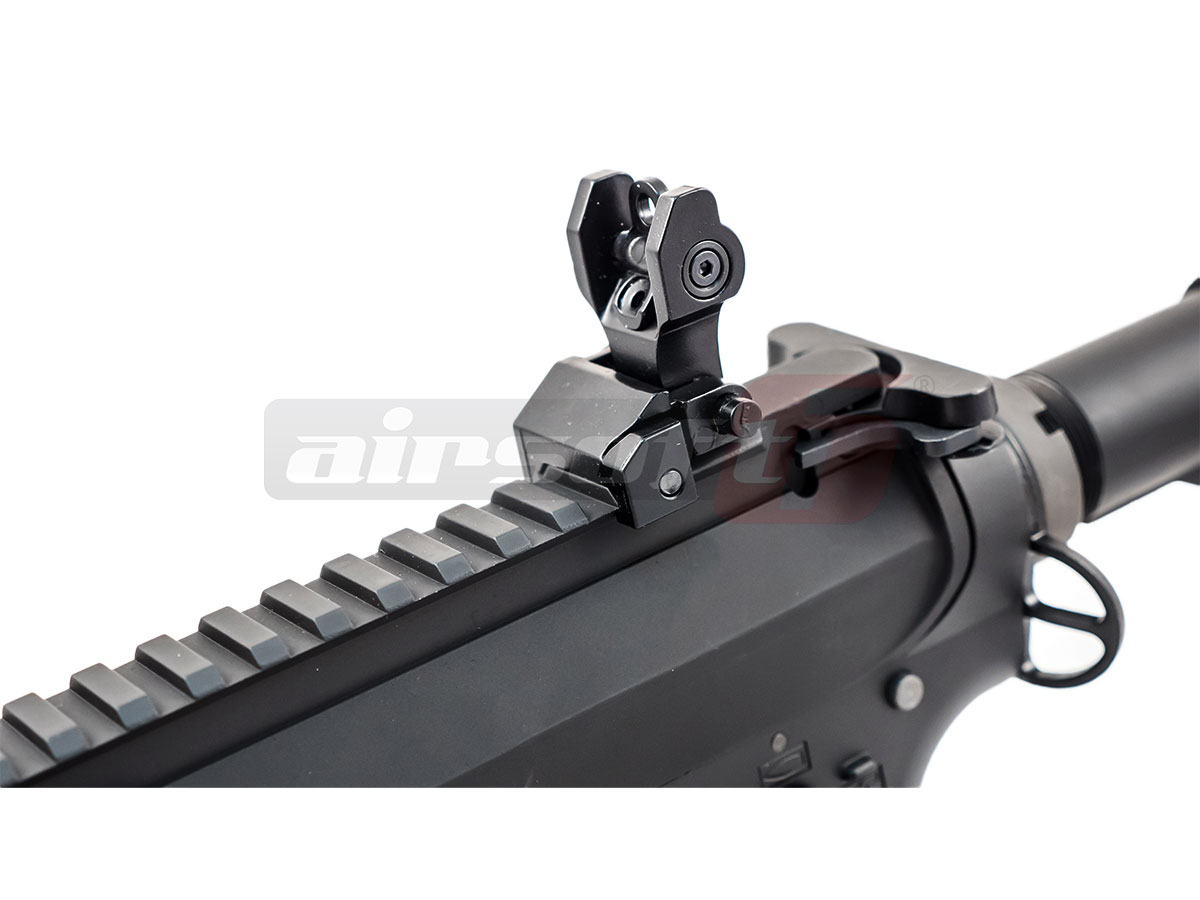 Replica de fata reprezinta modelul ARS4 si este bazata pe arhicunoscuta platforma M4. Daca toata lumea M4, atunci de sa nu ?! Corpul replicii este realizat din aliaje din aluminiu contribuind la scaderea greutatii totale. Sistemul frontal de sine, deasmenea este fabricat din aluminiu si este acoperit pe aproape toata suprafata de prinderi keymod, permitand astfel posibilitati vaste de accesorizare. In partea superioara avem parte de o sina standard kilometrica pe care vom putea monta tot felul de dispozitive de ochire. Replica este livrata cu un sistem clasic de ochire, reglabil si rabatabil. Patul replicii este tip SOPMOD si reprezinta si spatiul de inmagazinare al acumulatorului. Comenzile replicii sunt complet ambidextre; selectorul de tir, mag catch-ul si chiar bolt catch-ul. Deasupra manerului exista o prindere ambidextra, pentru curea de sustinere.
