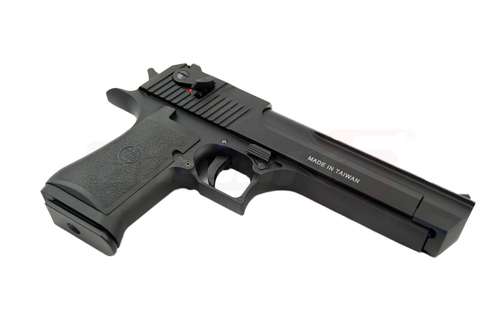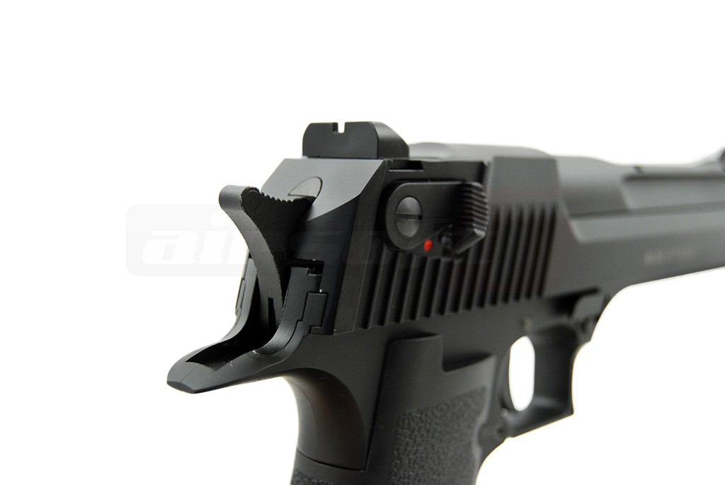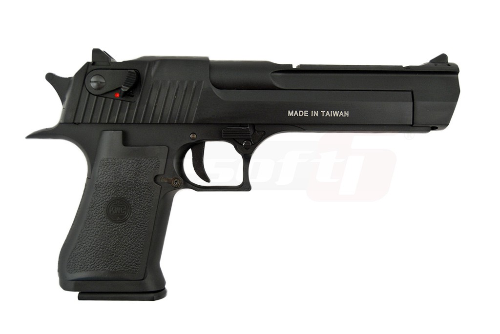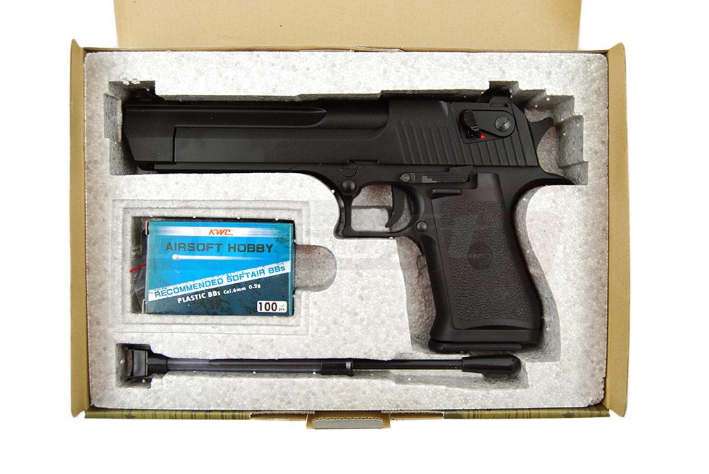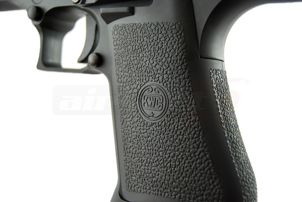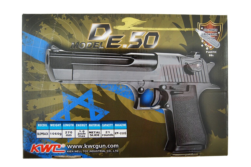 Replica de airsoft prezentata este fabricata de KWC. Modelul copiaza destul de atent Desert Eagle Mark XIX 50 A.E. Partile superioare si sinele sunt fabricate din metal rezistent iar manerul si partea inferioara de legatura sunt din plastic ABS. Greutatea replicii de airsoft nu este de trecut cu vederea, aprox 1.2 Kg. Asemenea pistolului adevarat, aceasta replica de airsoft este prevazuta cu recul. Aceasta jucarie nu este pentru cei slabi de inger. Dimensiunile sale sunt impresionante, caracterul impunator iar reculul pe masura. Comenzile pistolului sunt preponderent pe partea stanga, fiind astfel desemnat pentru dreptaci, selectorul de tir este ambidextru. Catarile replicii de airsoft sunt deasemenea din plastic si se pot regla lateral.