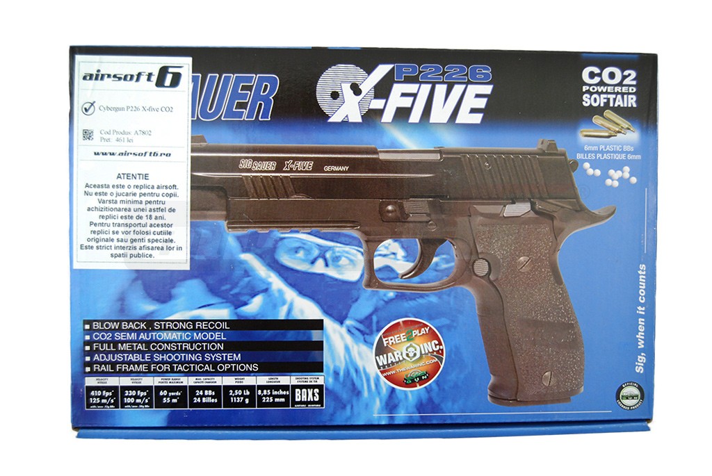 Comercializat de Cybergun, modelul SIG P226 X-Five copiaza cu acuratele pistolul adevarat. Este fabricat in mare parte din metal respectand functiile armei devarate. In partea din spate, asemenea platformei 1911, exista o siguranta de cocos, ambidextra. Pistolul este de tip Double action insemnand ca in momentul apasarii tragaciului cocosul replicii se armeza dupa care este eliberat declansand mecanismul de tragere.