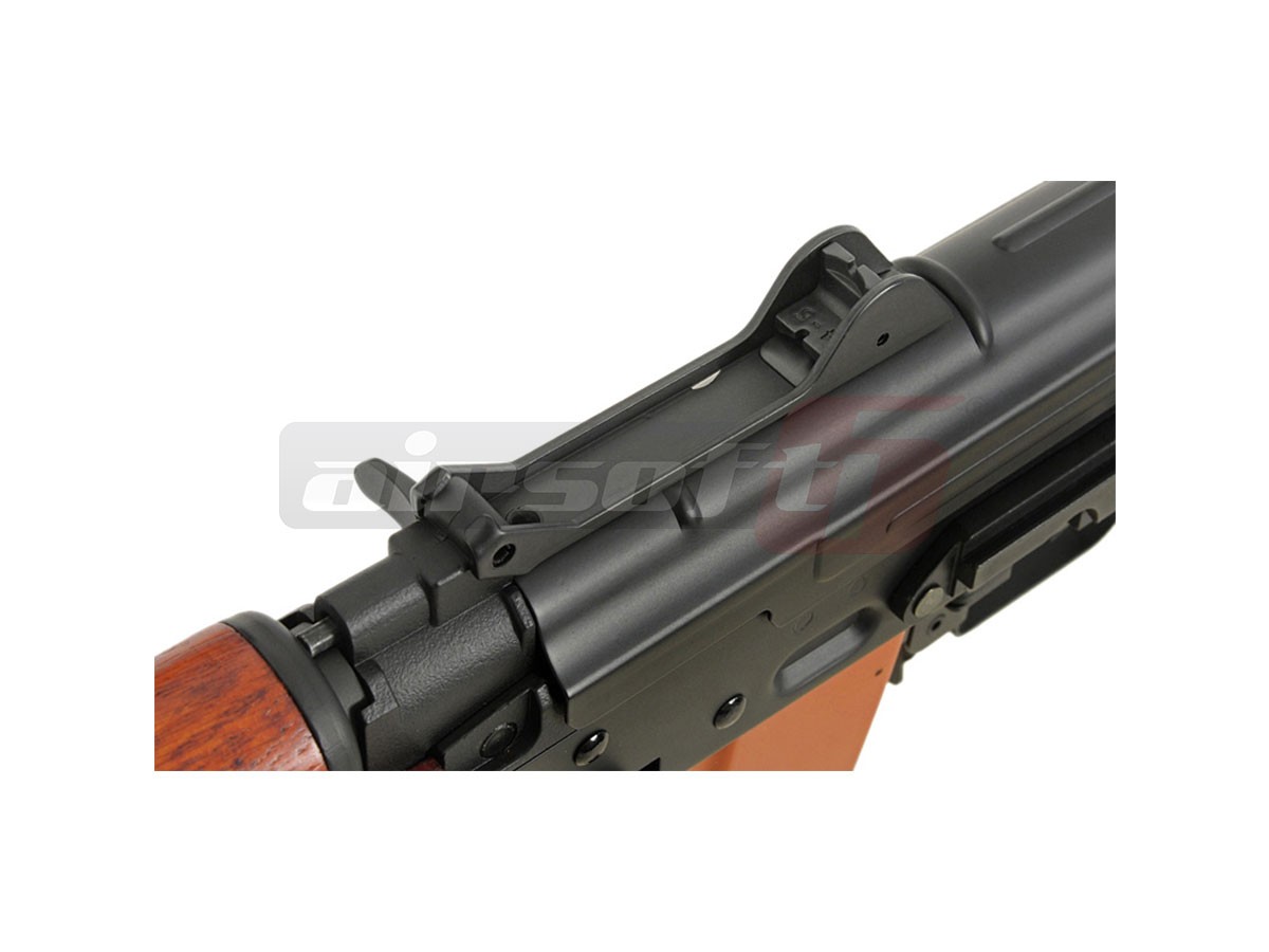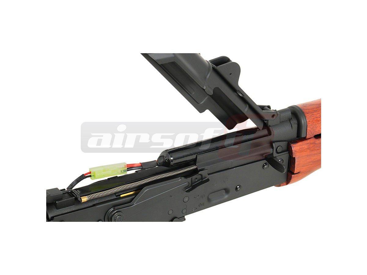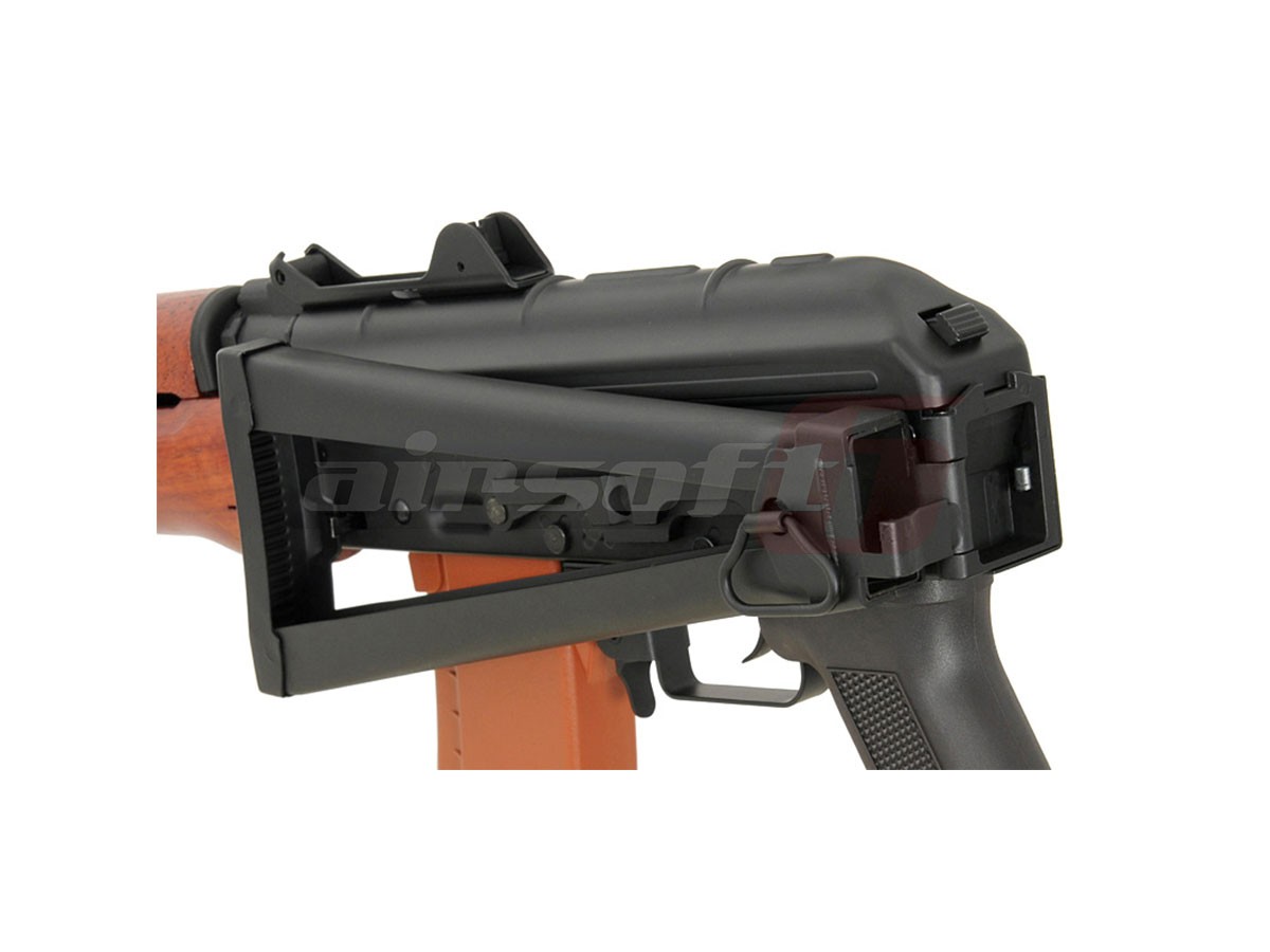 Cyma reuseste inca o data sa ne impresioneze cu designul si calitatea materialelor utilizate. Corpul este realizat din tabla presata nituita iar elementele de legatura deasemenea sunt din metal. Singurul element din plastic este Manerul, ulucul este din lemn. Capacul superior este fixat cu ajutorul unei balamale, usurand mult instalarea acumulatorului. In partea stanga a replicii de airsoft se poate observa o sina pentru montarea sinelor speciale sau direct a dispozitivelor optice specifice platformelor AK. Patul este pliabil spre stanga. Se fixeaza ferm atat exins cat si rabatat.