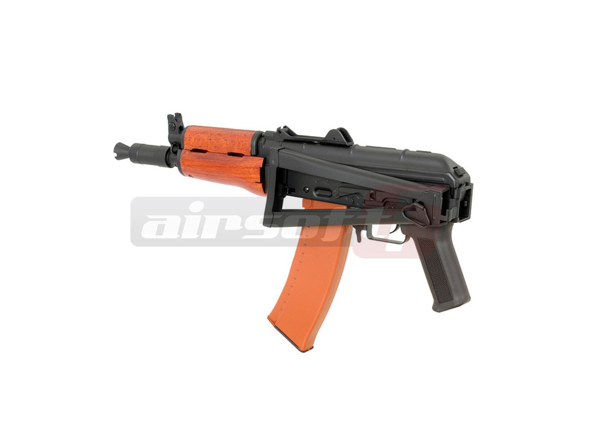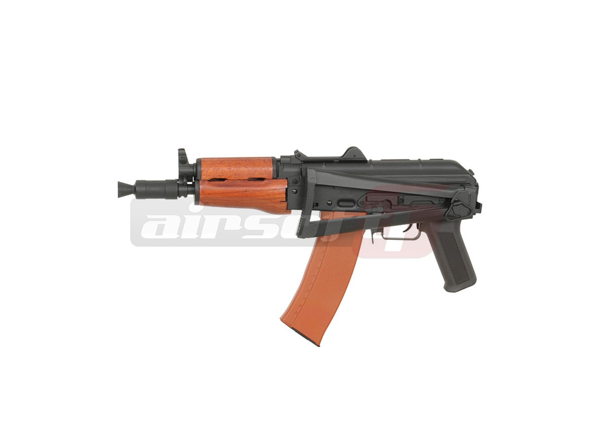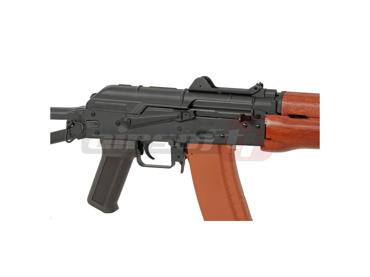 Cyma reuseste inca o data sa ne impresioneze cu designul si calitatea materialelor utilizate. Corpul este realizat din tabla presata nituita iar elementele de legatura deasemenea sunt din metal. Singurul element din plastic este Manerul, ulucul este din lemn. Capacul superior este fixat cu ajutorul unei balamale, usurand mult instalarea acumulatorului. In partea stanga a replicii de airsoft se poate observa o sina pentru montarea sinelor speciale sau direct a dispozitivelor optice specifice platformelor AK. Patul este pliabil spre stanga. Se fixeaza ferm atat exins cat si rabatat.