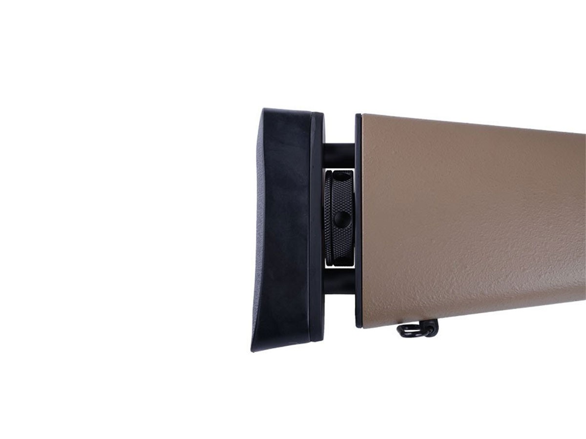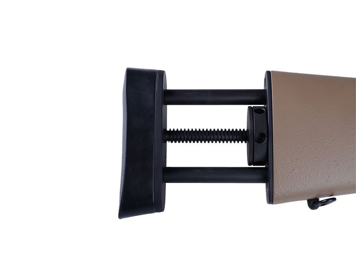 Corpul replicii este foarte solid si a fost fabricat din ABS negru mat de inalta calitate. Incarcatorul replicii este din ABS si are o capacitate de 25 bile. In partea din spate, capacul patului este acoperit cu un strat de cauciuc, aderent pentru o buna fixare a umarului. Ceea ce este interesant este ajustarea patului, dupa preferintele utilizatorului. Patul ajunge la o lungime maxima de 1170mm. Corpul replicii este asigurat cu doua sisteme de prindere pentru arma sau bipod. Toate celelalte elemente au fost fabricate din metal: teava exterioara, tragaciul, sina RIS. In plus replica este echipata cu sina RIS pe care se poate monta un dispozitiv de ochire.